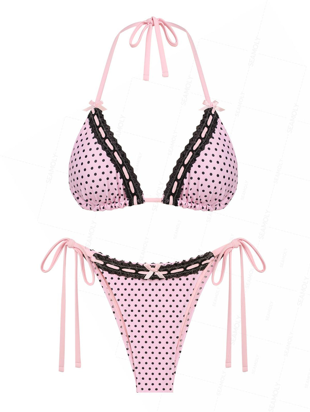 Seamolly Polka Dot Lace Bowknot Halter Triangle String Bikini Set