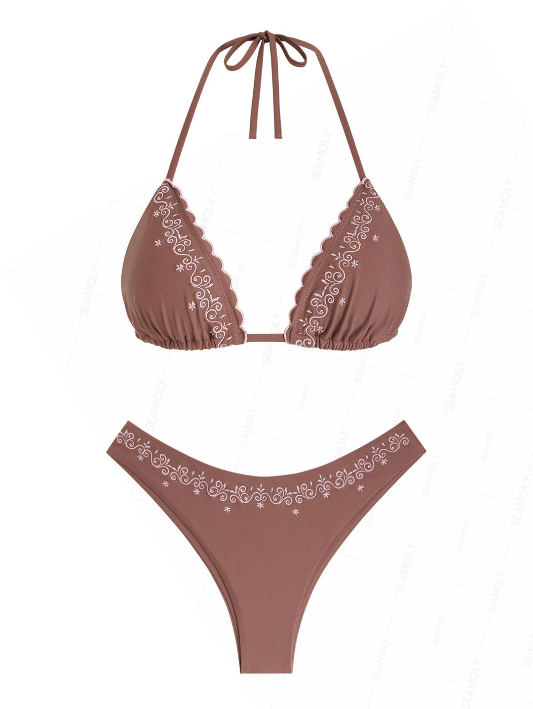 Seamolly Embroidered Scalloped Edge Halter Triangle Bikini Set