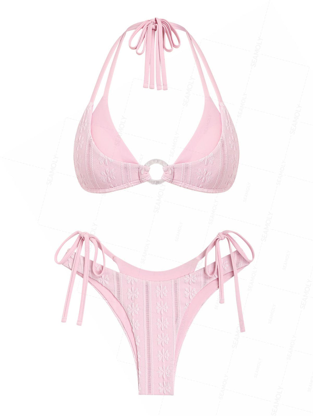 Seamolly Light Pink Floral Jacquard Textured O Ring Double Layer Bikini Set