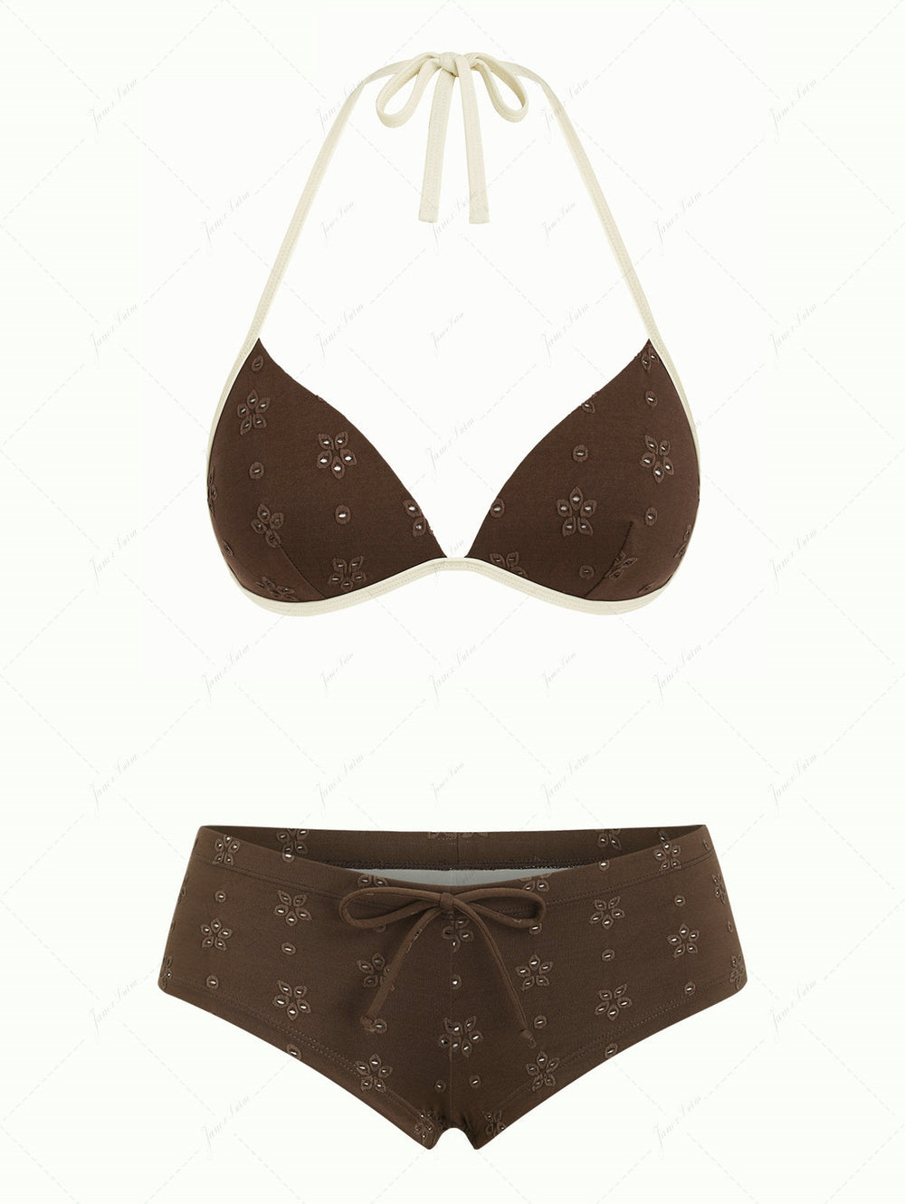 Deep Coffee Recycled Fabric Eyelet Jacquard Push Up Top & Cheeky Boyshorts Bikini Set
