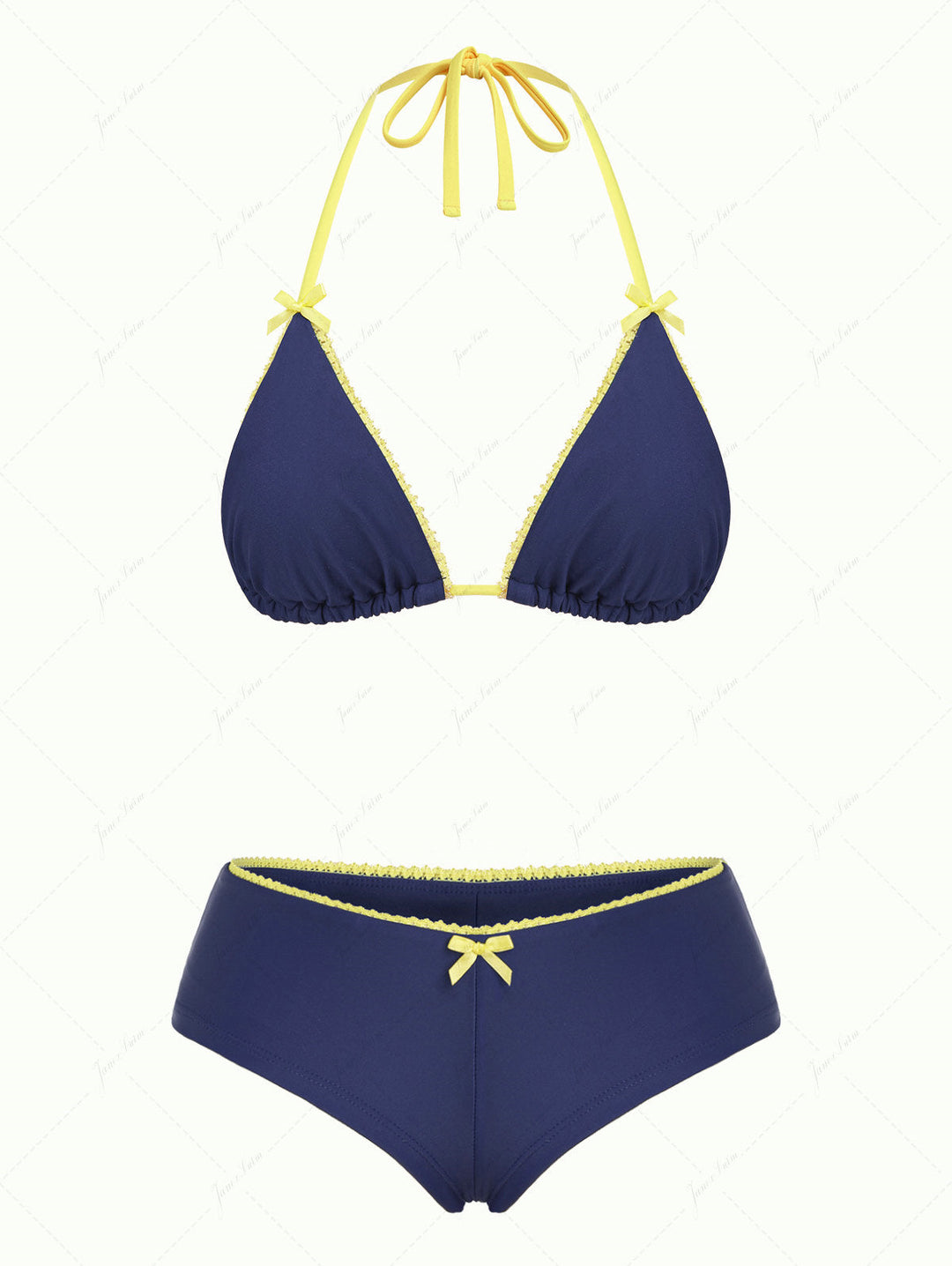 Deep Blue Contrast Lace Bowknot Triangle Cheeky Boyshorts Bikini Set