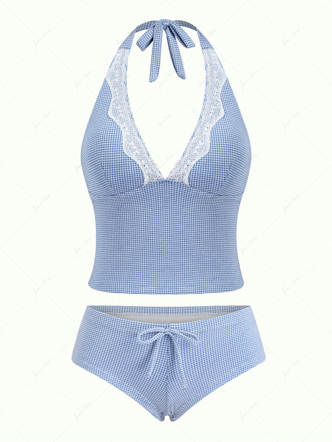 Blue Knitted Plaid Lace Halter Tied Cheeky Boyshorts Tankini Set