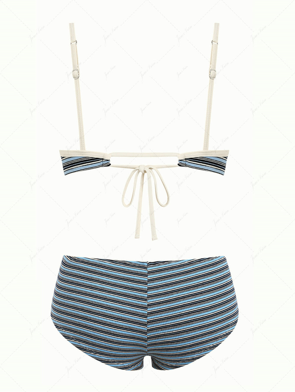 Blue Striped Bowknot Tank Style Lace Up Cheeky Boyshorts Bikini Set