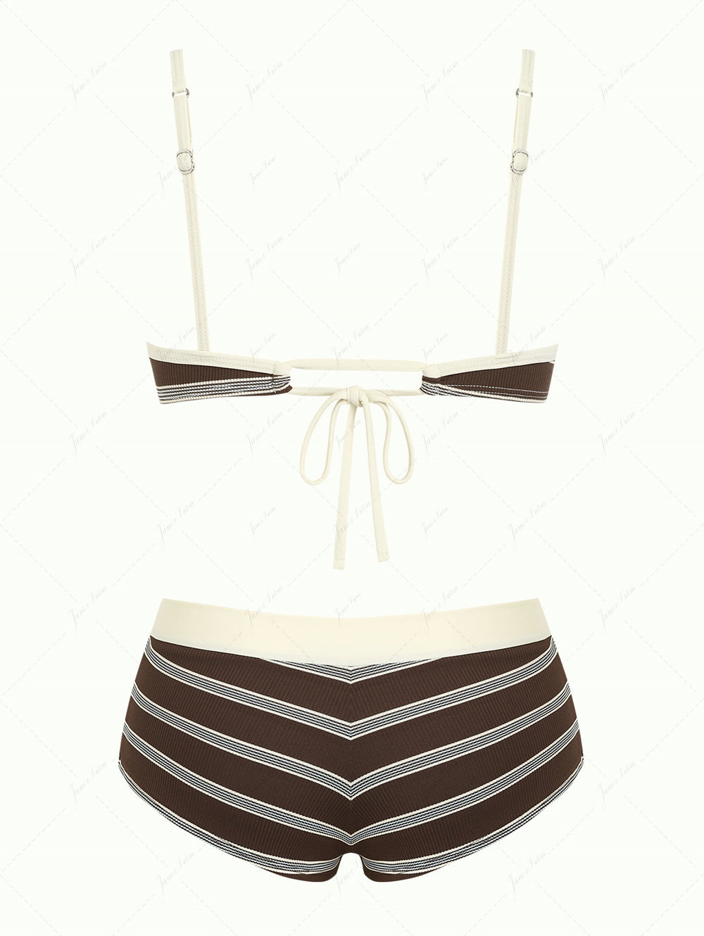 Deep Coffee Striped Bowknot Tank Style Cheeky Boyshorts Bikini Set