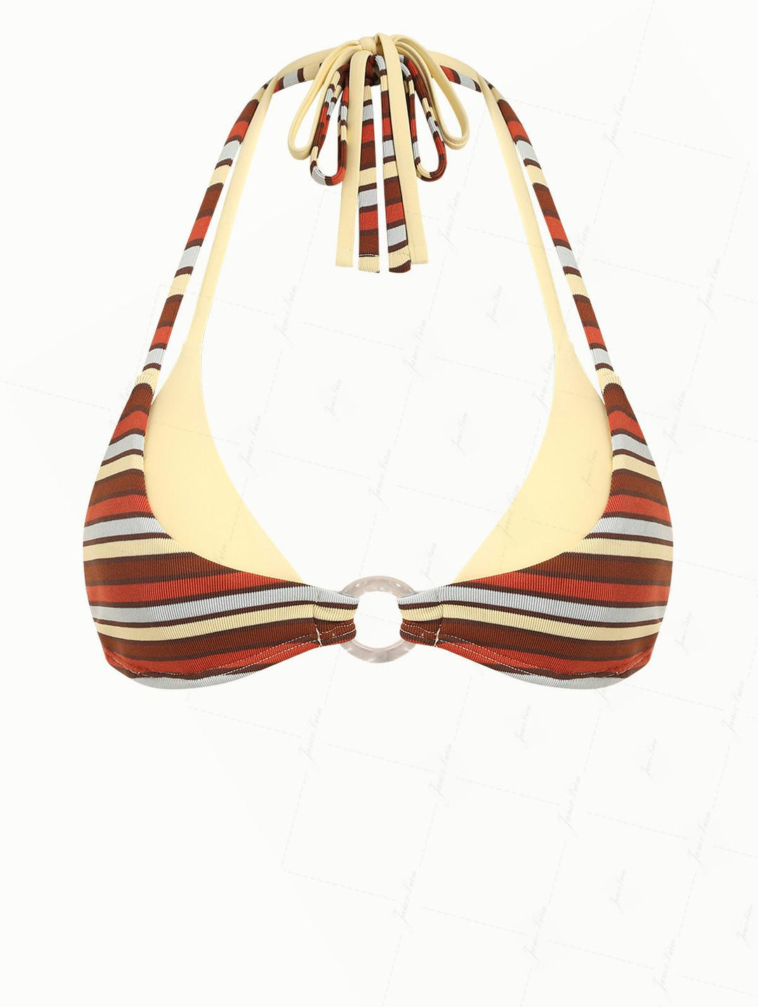 Yellow Contrast Color Ribbed Knit Striped O Ring Double Layer Bikini Top