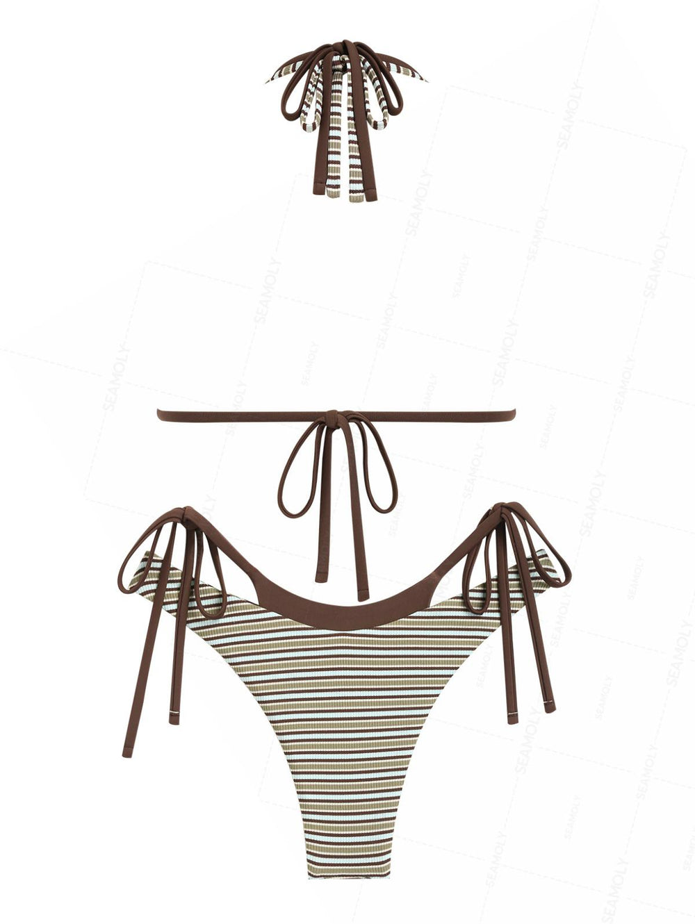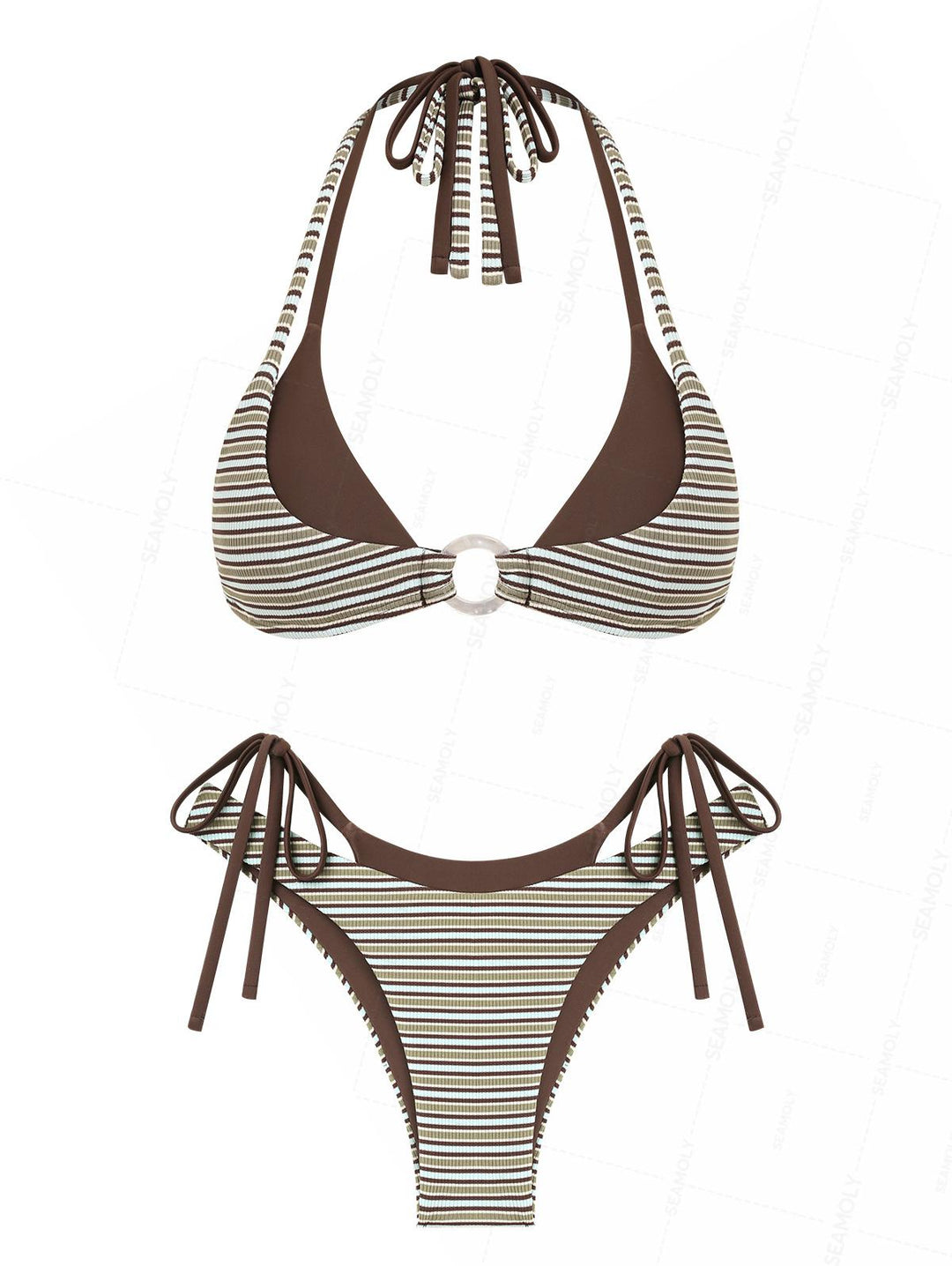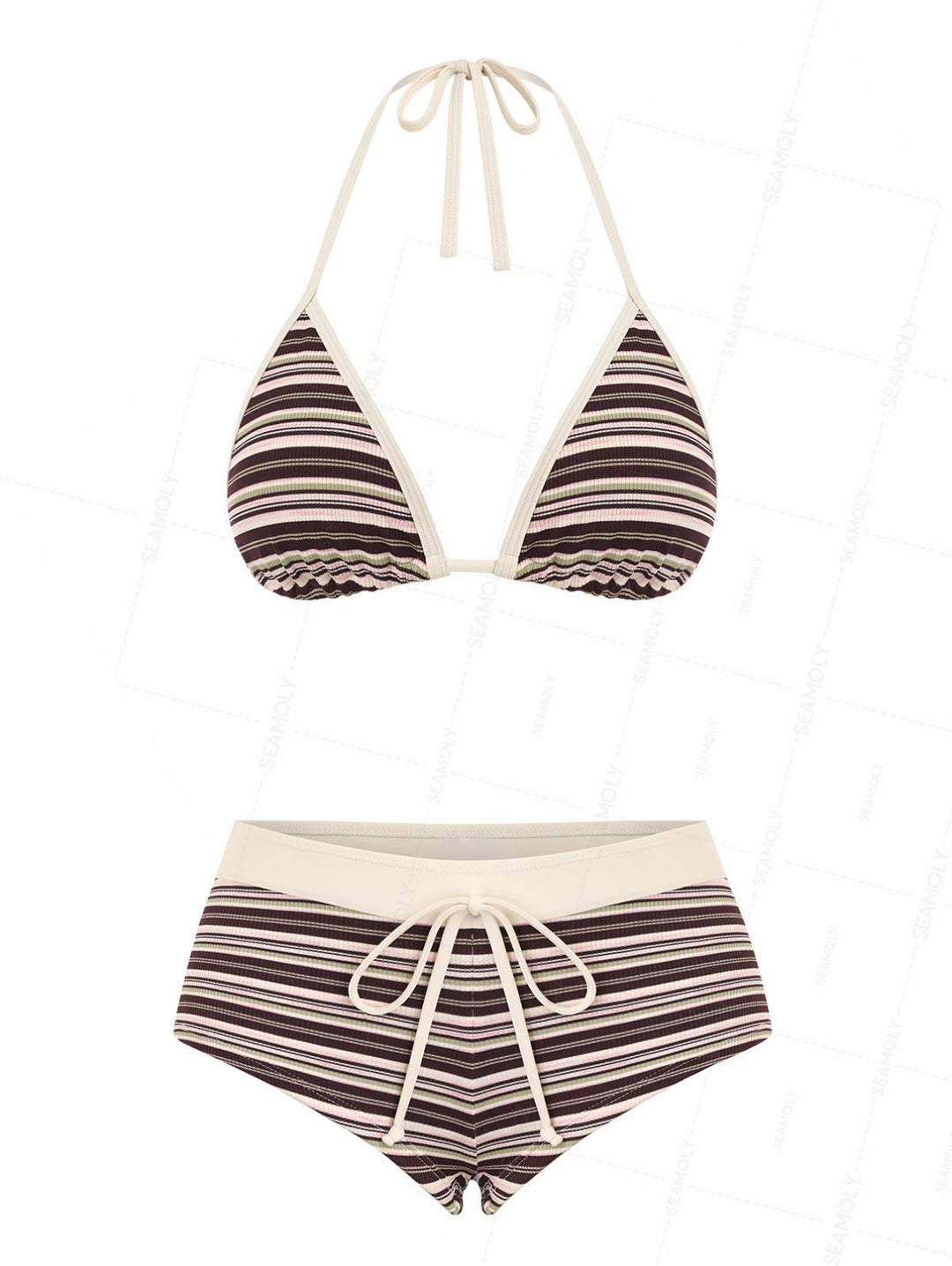 Seamolly Striped Lace Trim Bowknot Decor Halter Triangle Tie Side Bikini Set
