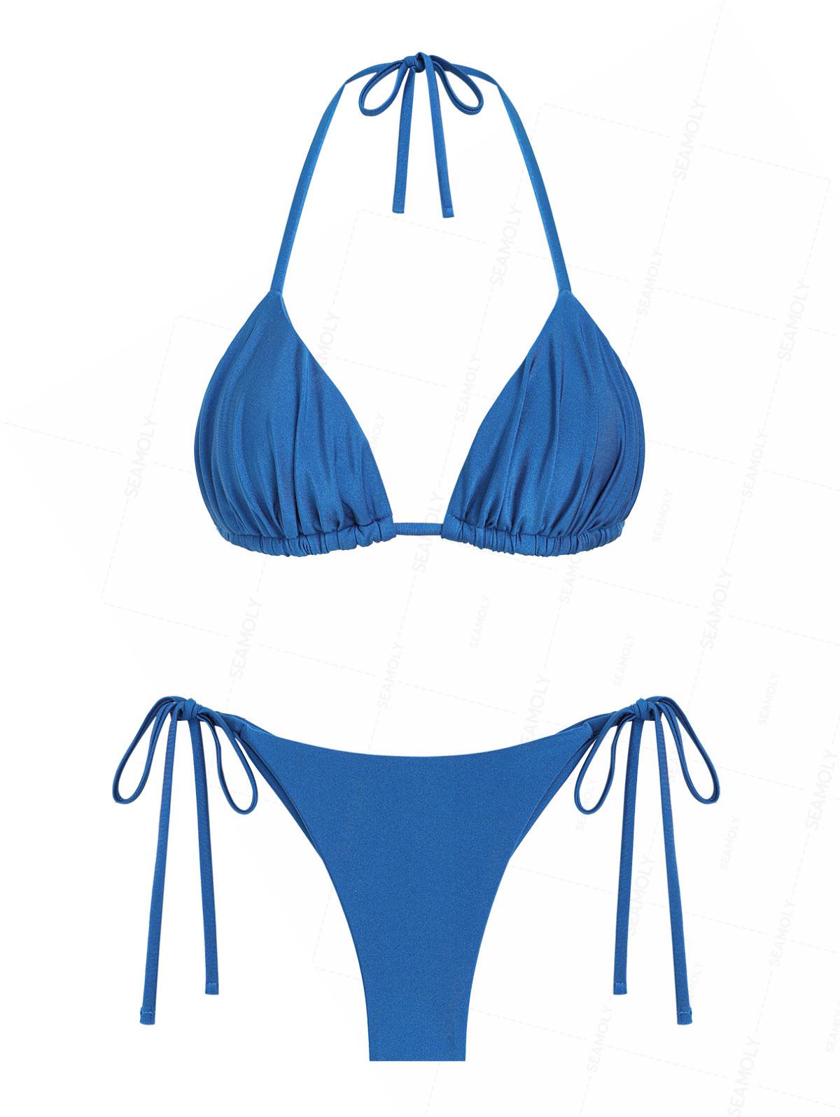 Seamolly Solid Color Ruched Halter Triangle Top & Brazilian Bottom Bikini Set