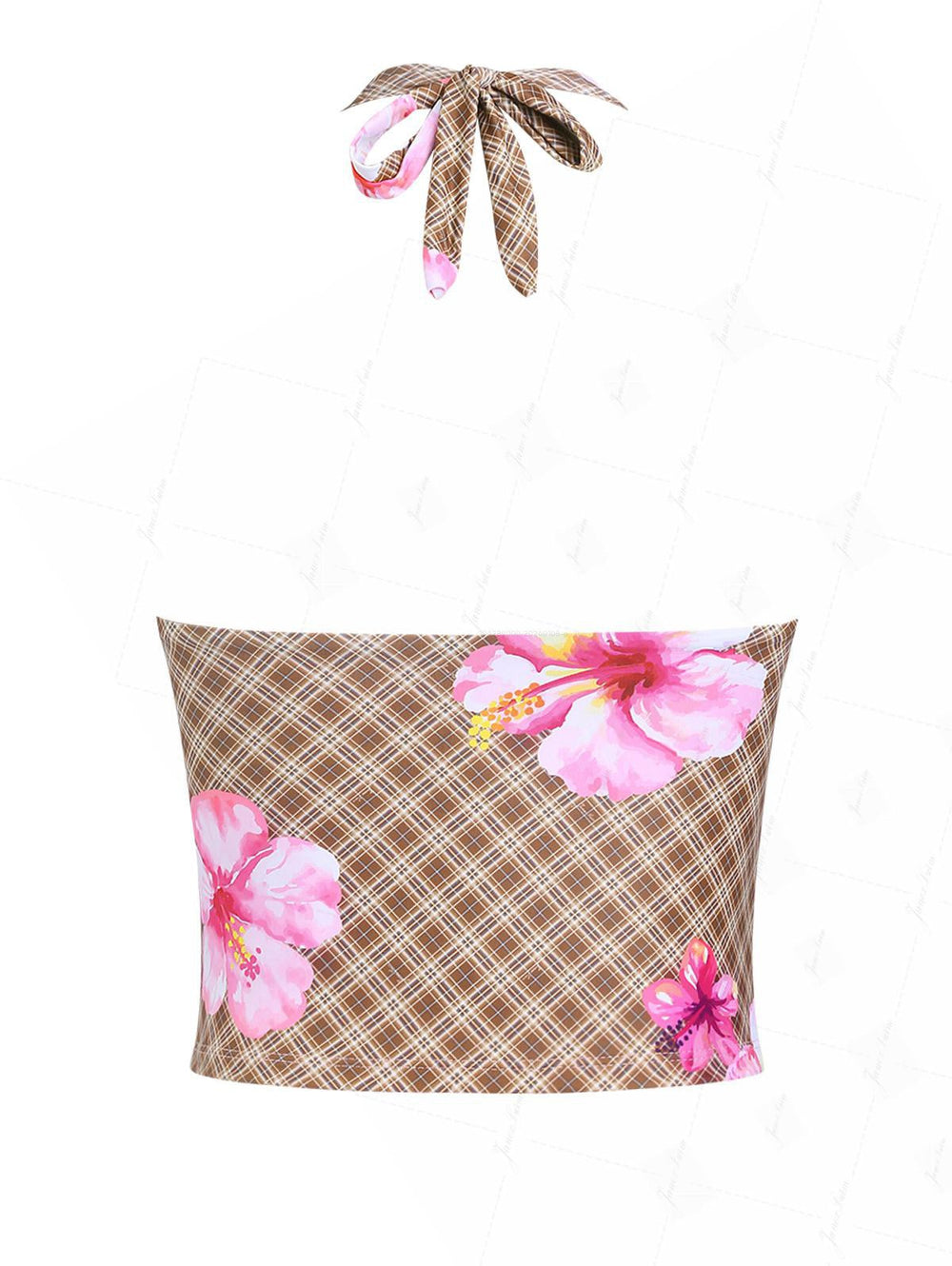 Coffee Plaid Floral Print Frilled Ruffles Plunging Neck Halter Tied Tankini Top
