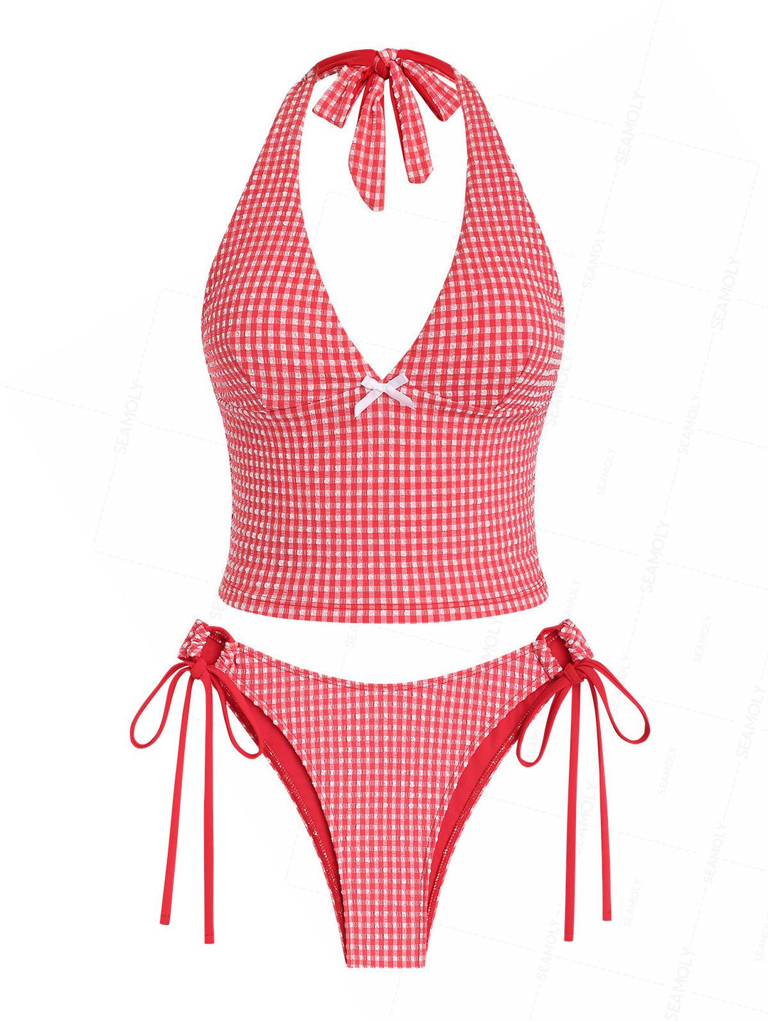Seamolly Gingham Bowknot Lace Up Back Halter Tankini Set