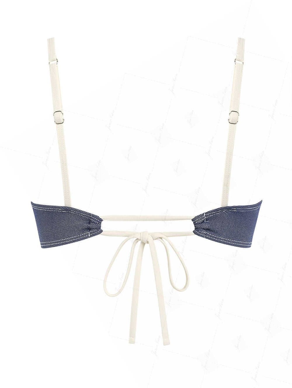 Deep Blue Denim Spliced Ruched Ruffles Trim Bowknot Bikini Top