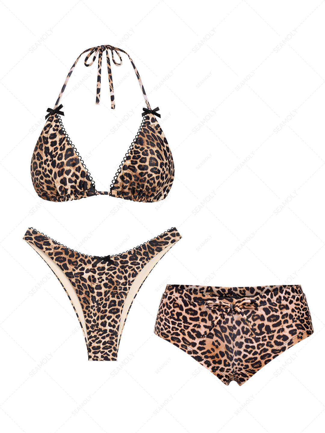 Seamolly 3 Piece Leopard Print Picot Trim Bowknot Triangle Cheeky Boyshort Bikini Set