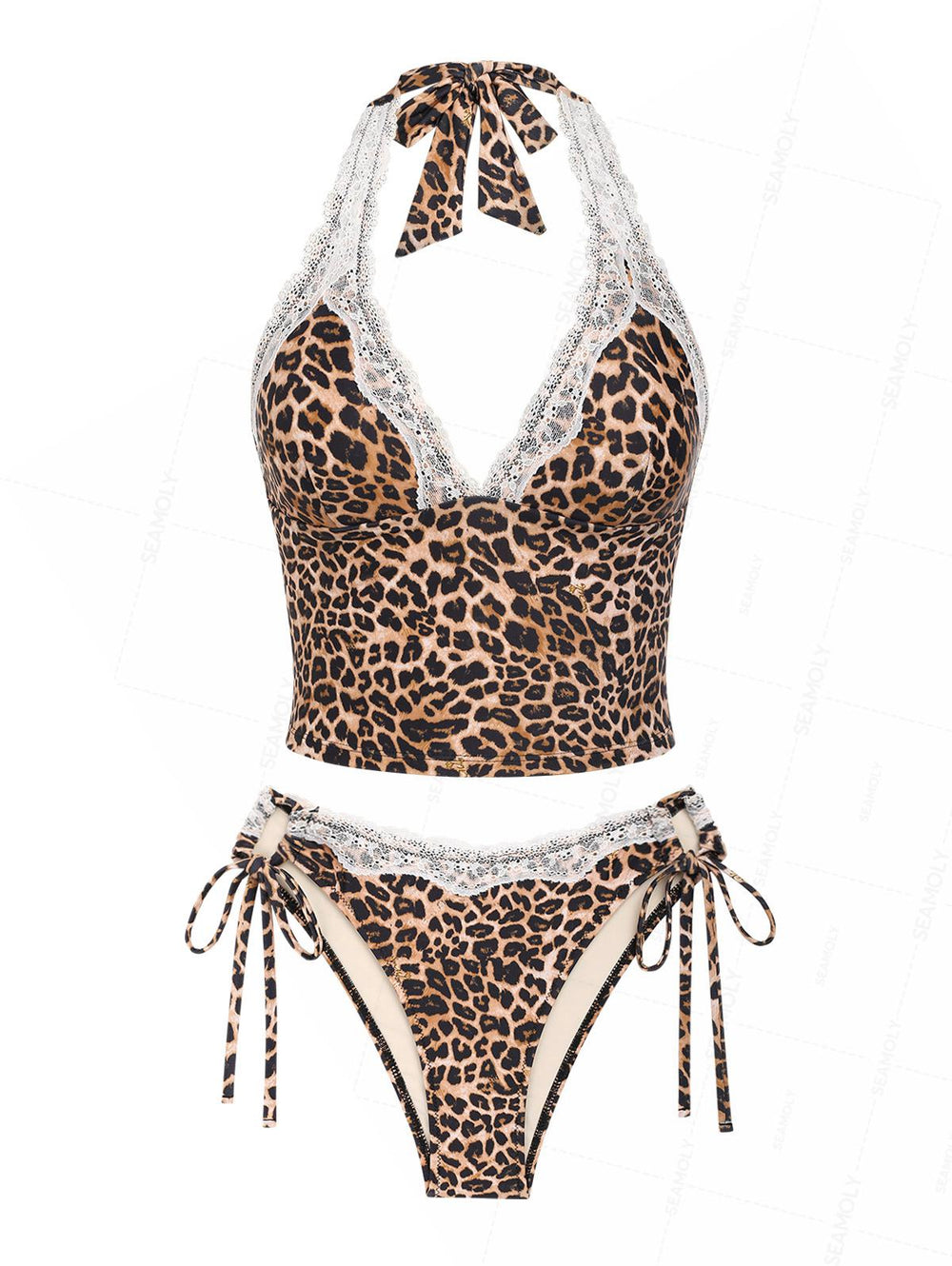 Seamolly Leopard Lace Trim Bowknot Decor Halter Tankini Set