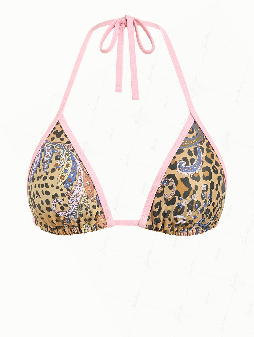 Brown Leopard Paisley Print Contrast Binding Triangle Bikini Top