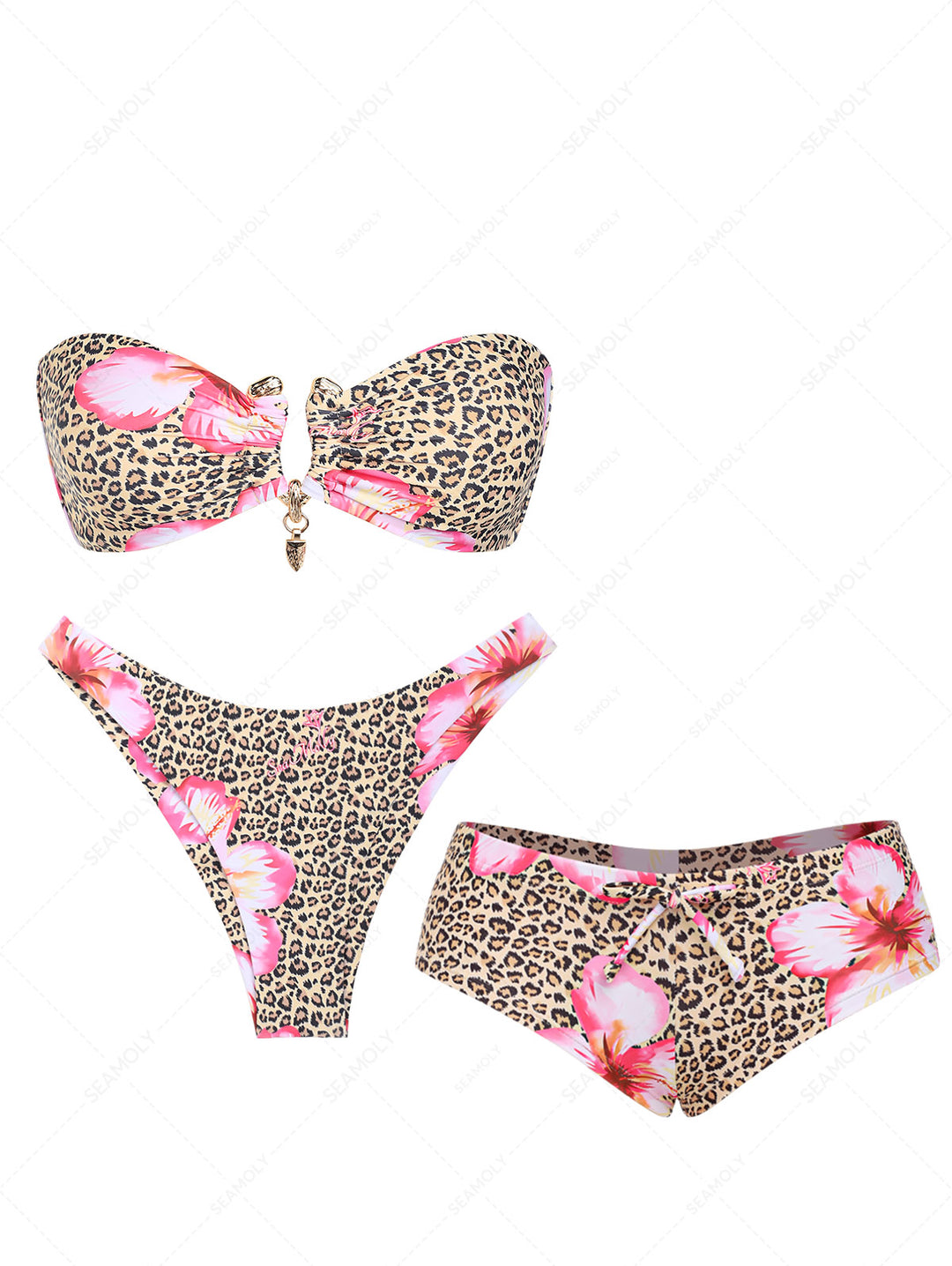 Seamolly 3 Piece Leopard Hawaii Style Hibiscus Print Bandeau Brazilian Cheeky Boyshort Bikini Set