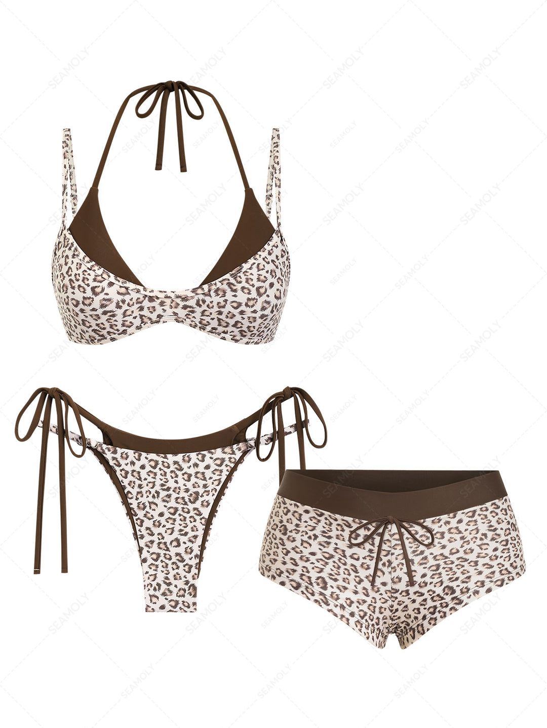 Seamolly 3 Piece Leopard Print String Double Layer Cheeky Boyshort Bikini Set