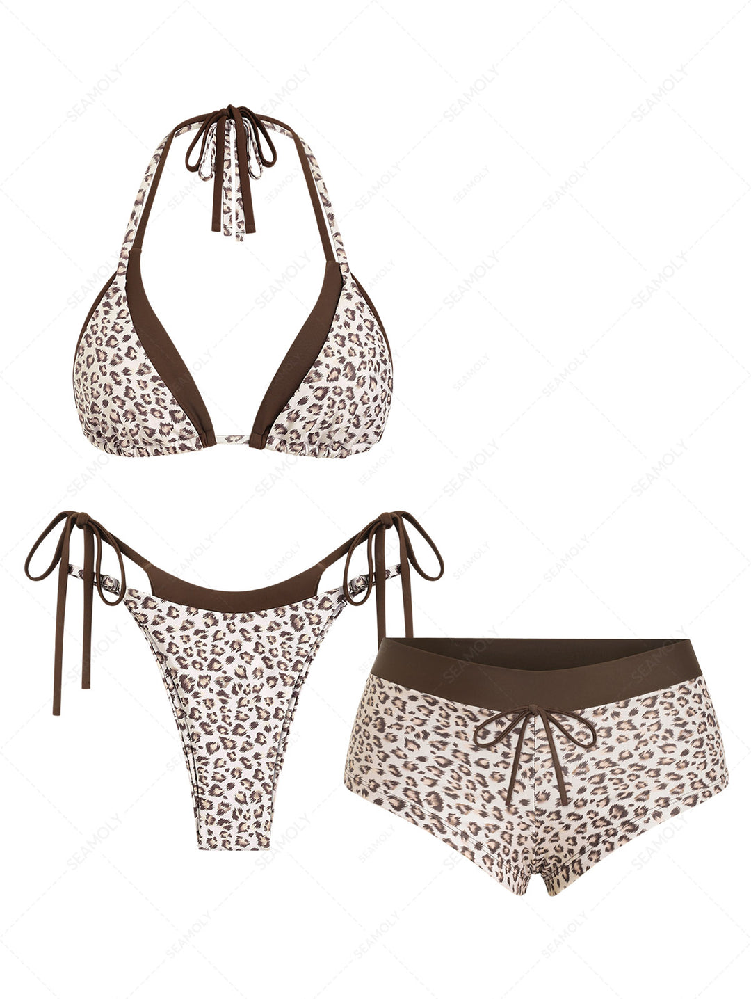 Seamolly 3 Piece Leopard Print Picot Trim Bowknot Triangle Cheeky Boyshort Bikini Set