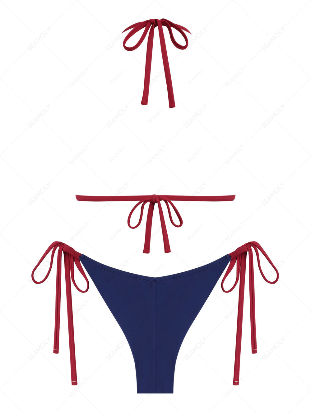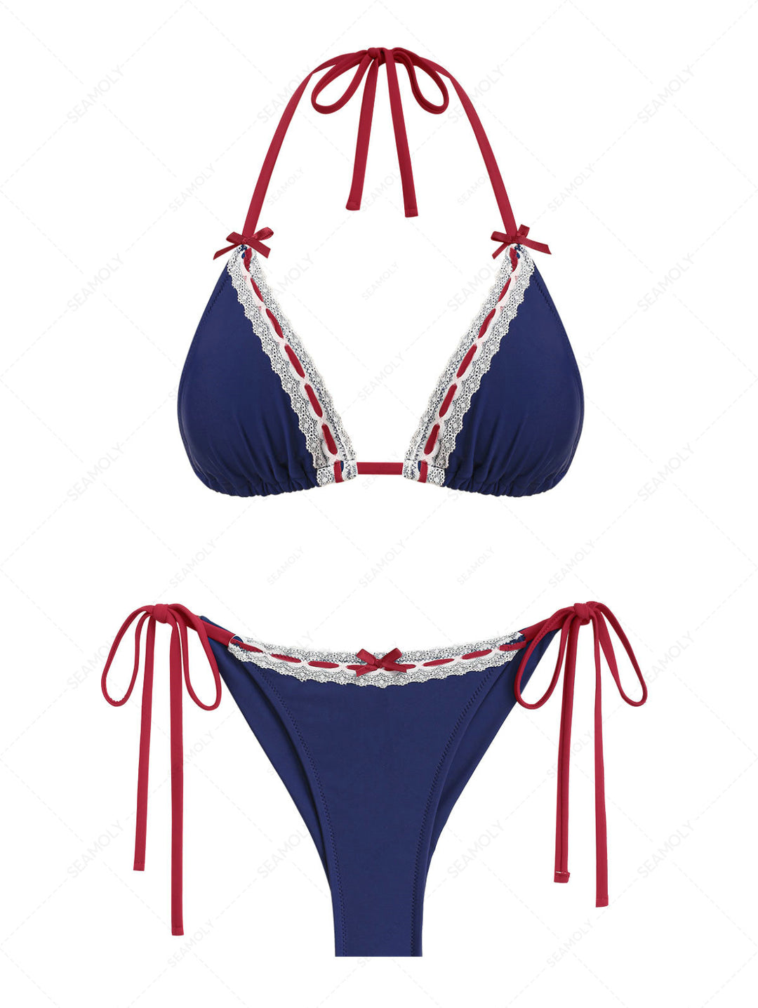 Seamolly Contrast Lace Bowknot Triangle Top & Cheeky Brazilian Bottom Bikini Set for 4th of July