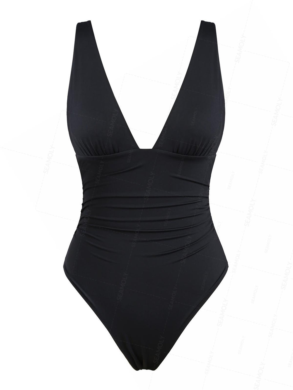 Seamolly Solid Color Ruched Plunging Neck One-piece Swimsuit