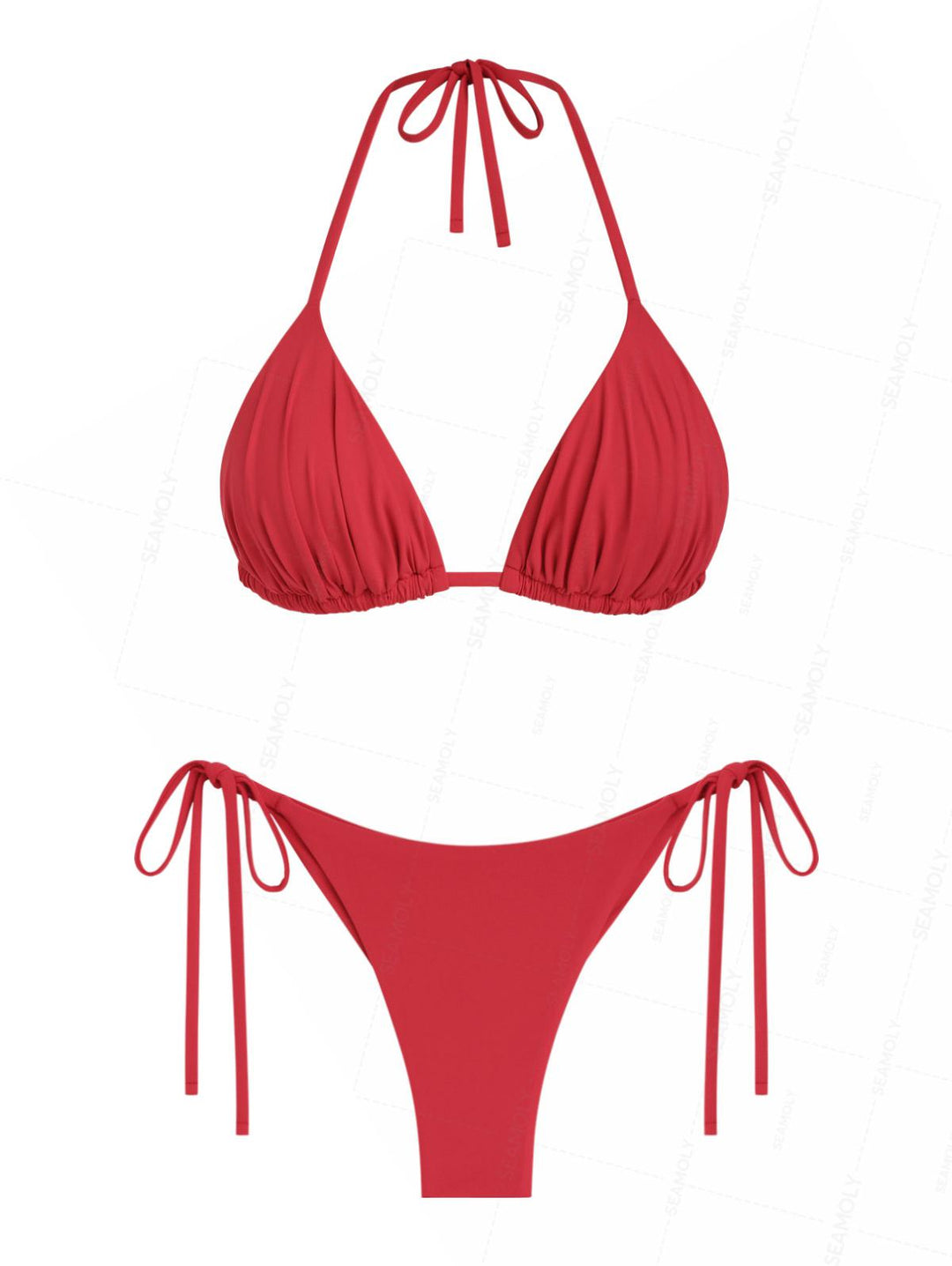 Seamolly Solid Color Ruched Halter Triangle Top & Brazilian Bottom Bikini Set