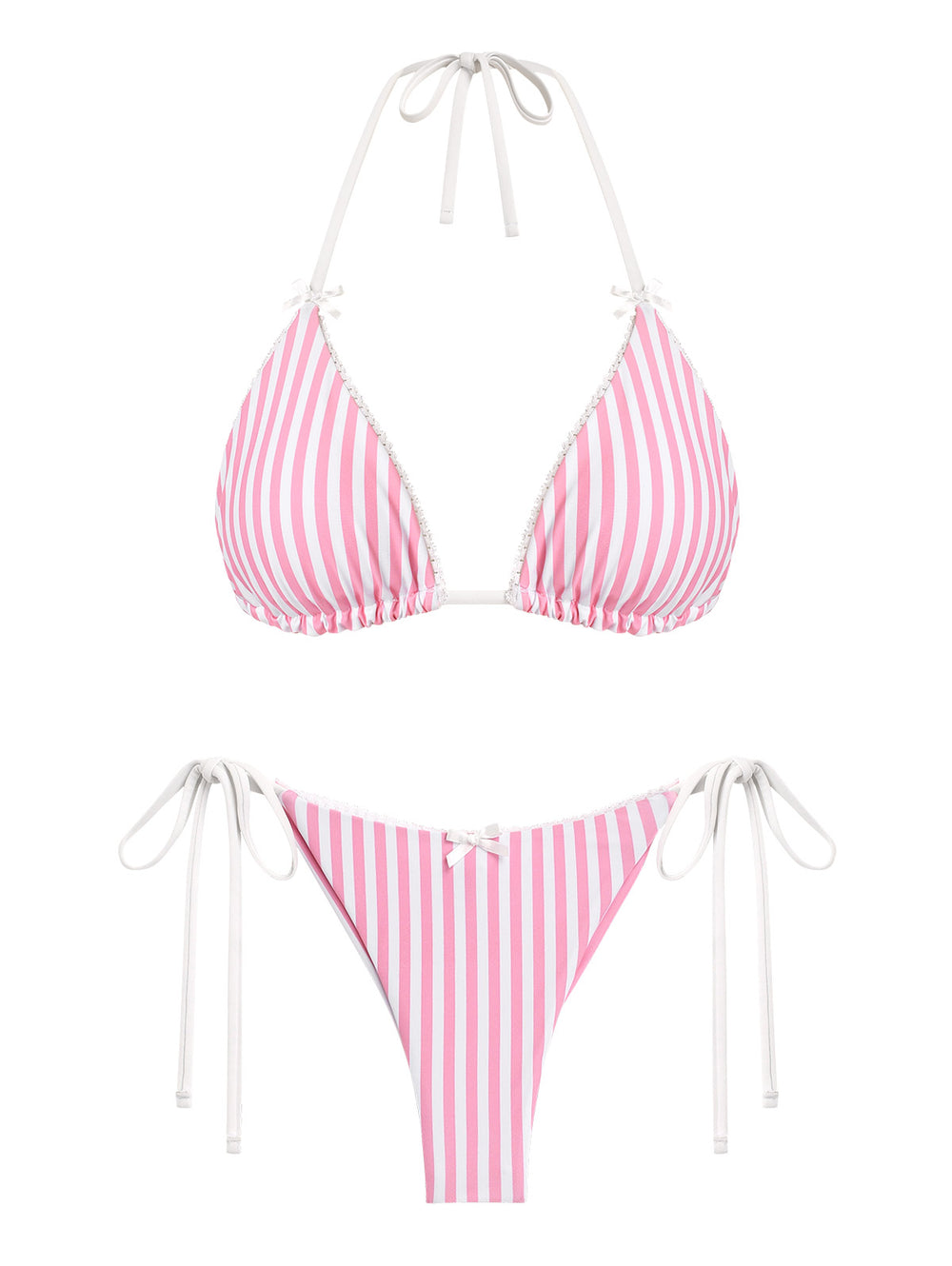 Seamolly Striped Lace Bowknot Triangle Top & Cheeky Brazilian Bottom Bikini Set