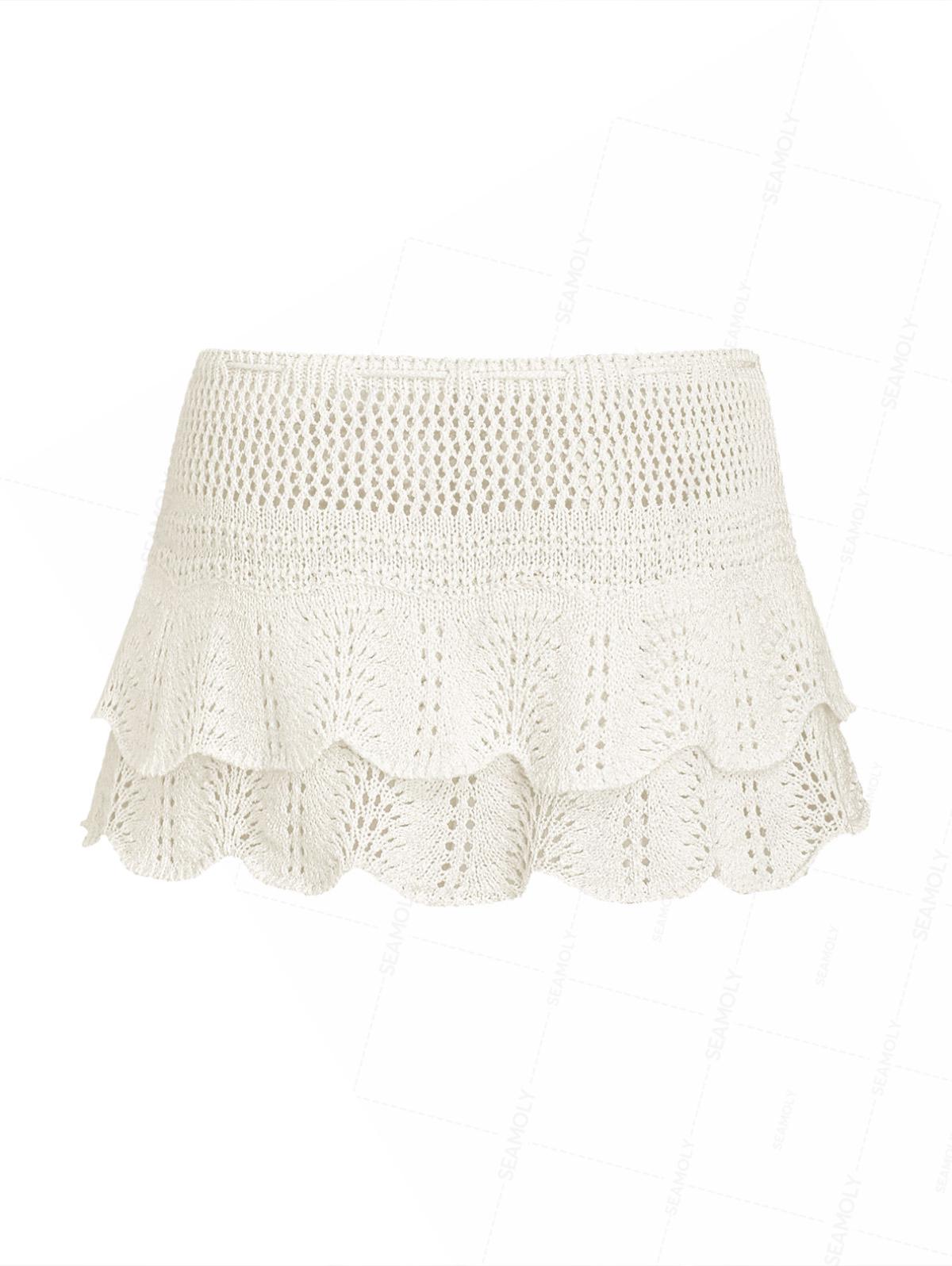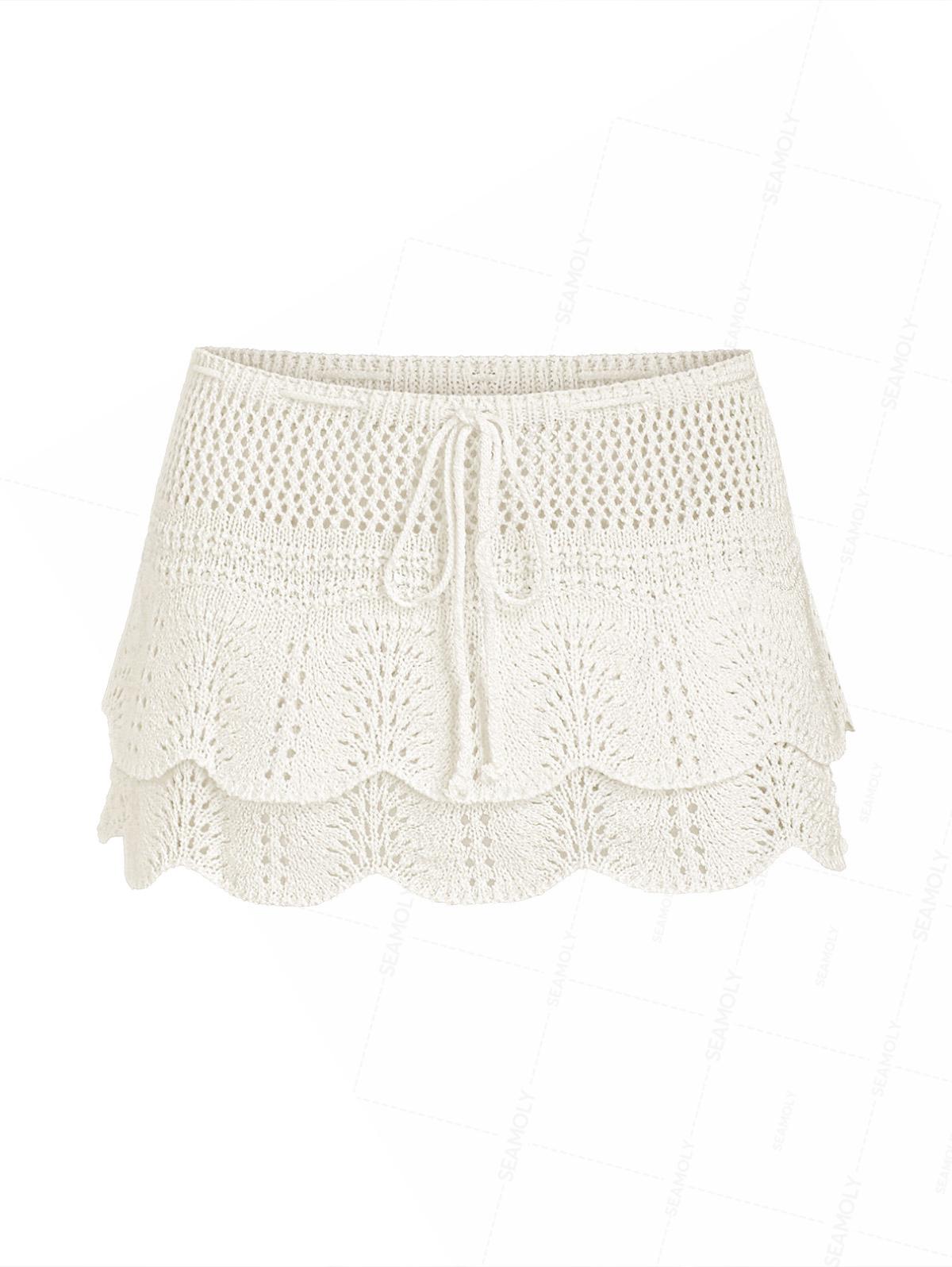 Drawstring Double Layered Crochet Scalloped Hem Mini Beach Cover Up Skirt