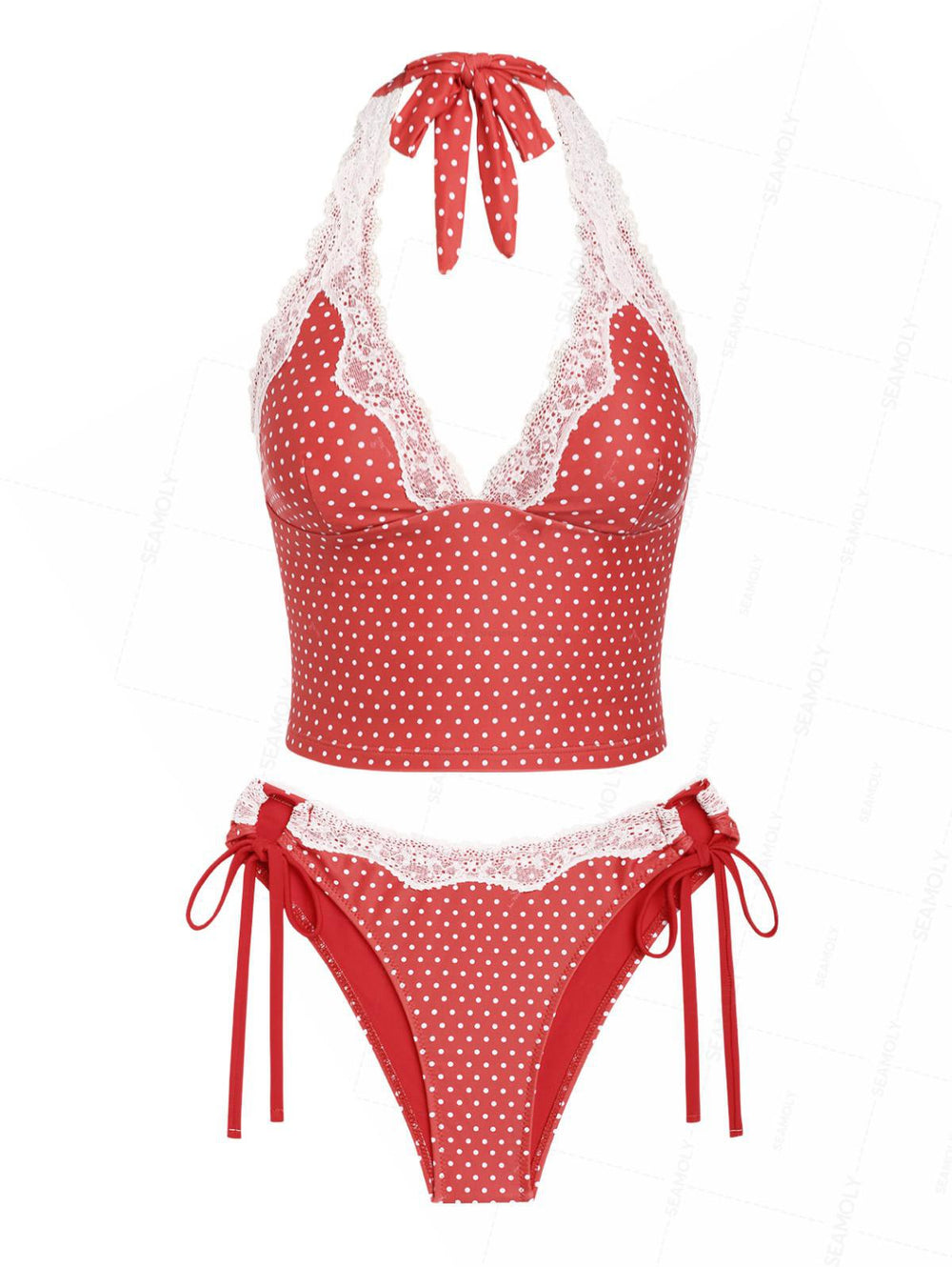 Seamolly Polka Dot Lace Halter Tied Tank Top & Hipster Bottom Tankini Set