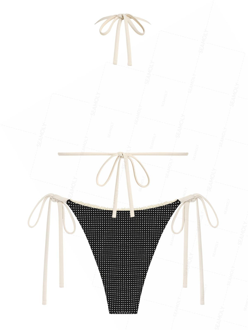 Seamolly Pin Dot Jacquard Lace Bowknot Halter Triangle Tie Side Bikini Set