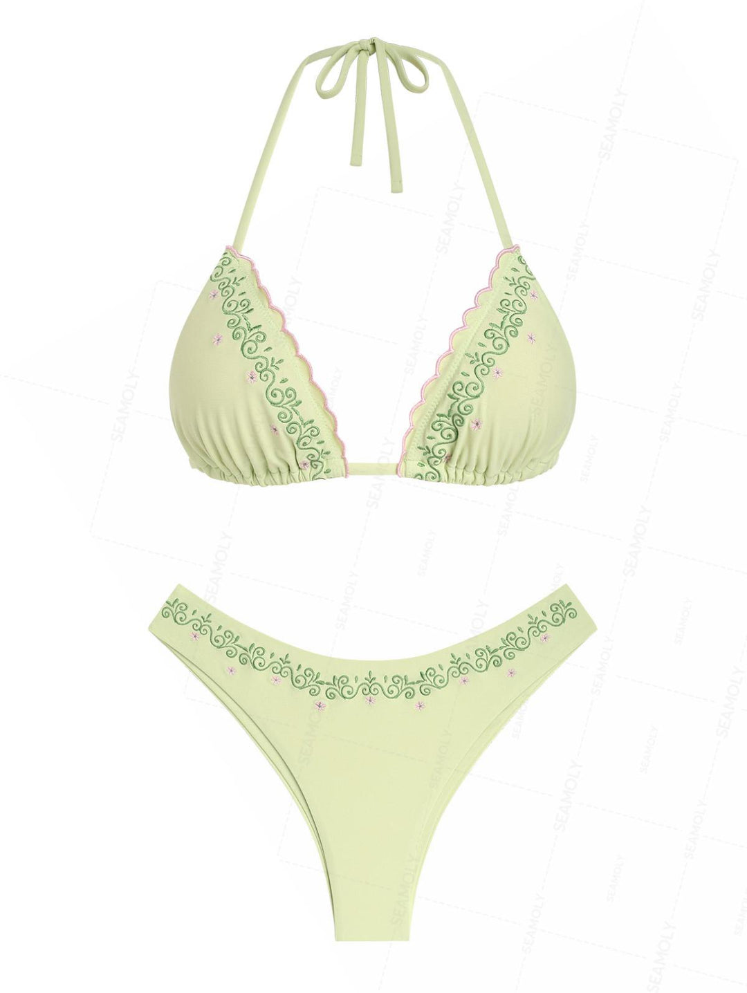 Seamolly Vintage Embroidered Scalloped Edge Halter Triangle Bikini Set