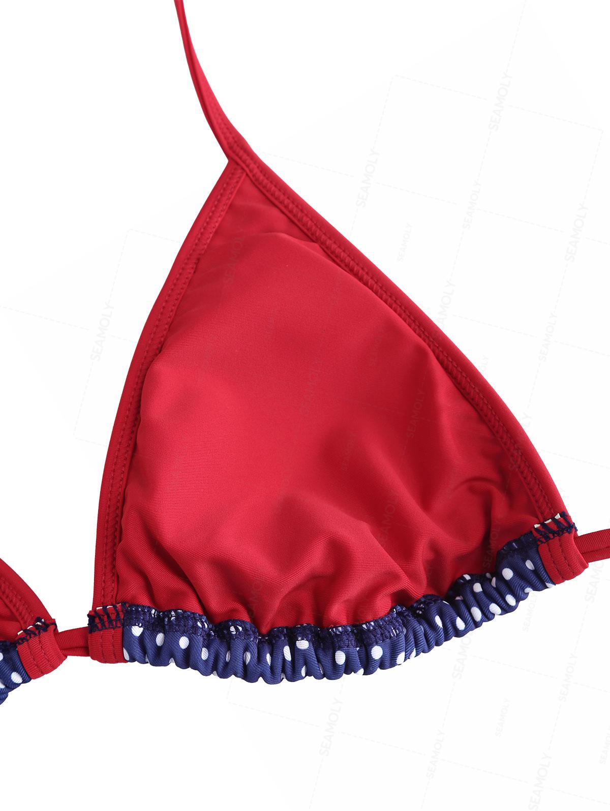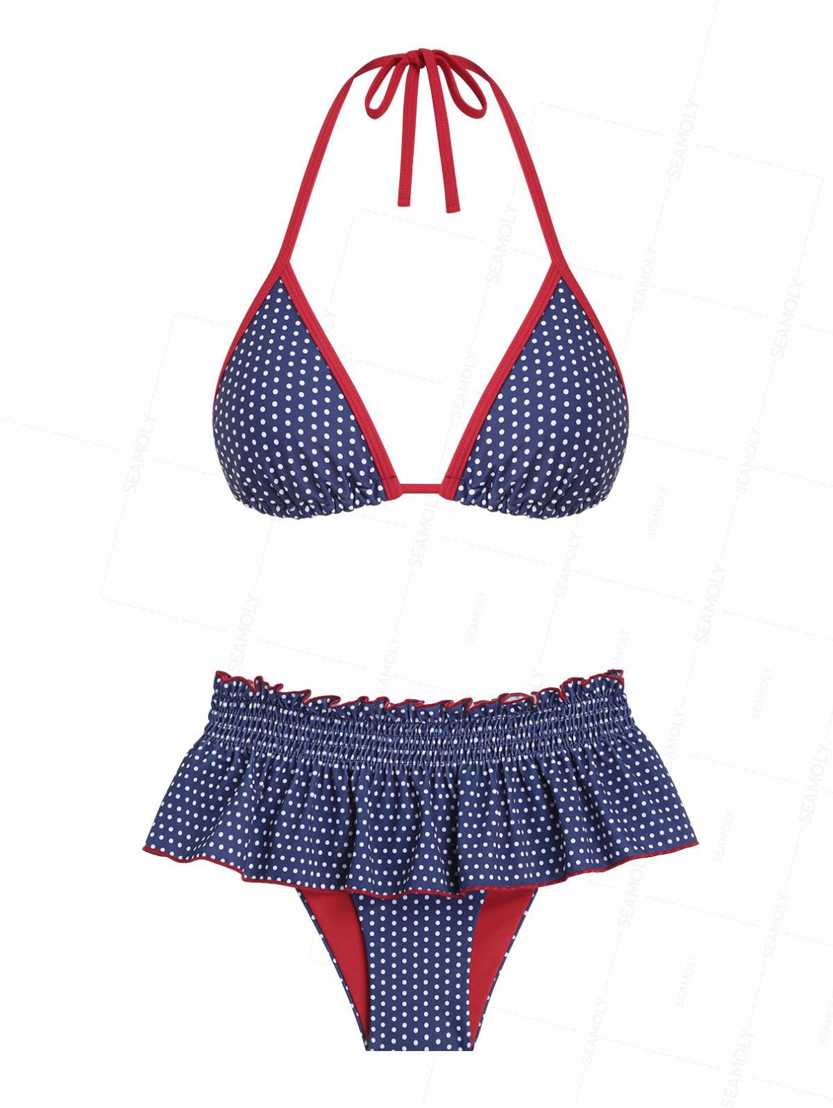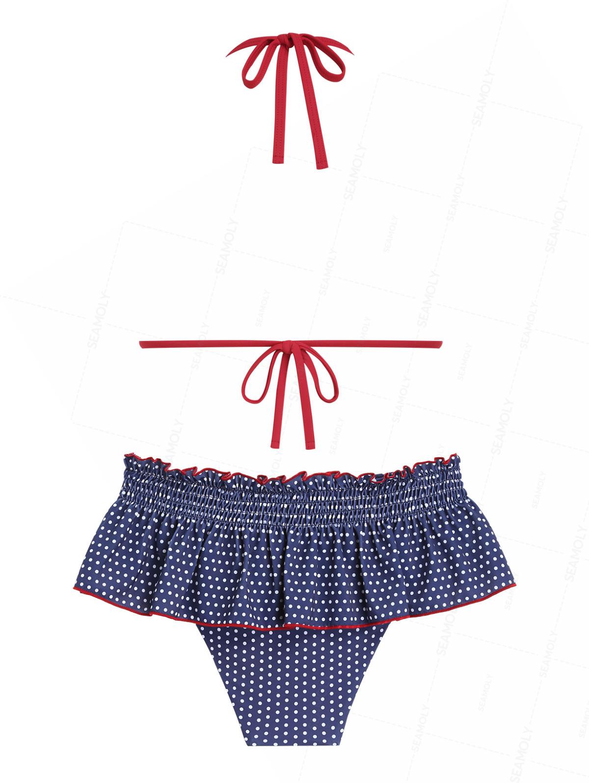 Seamolly Polka Dot Print Contrast Binding Smocked Ruffles Skirtini Bikini Set