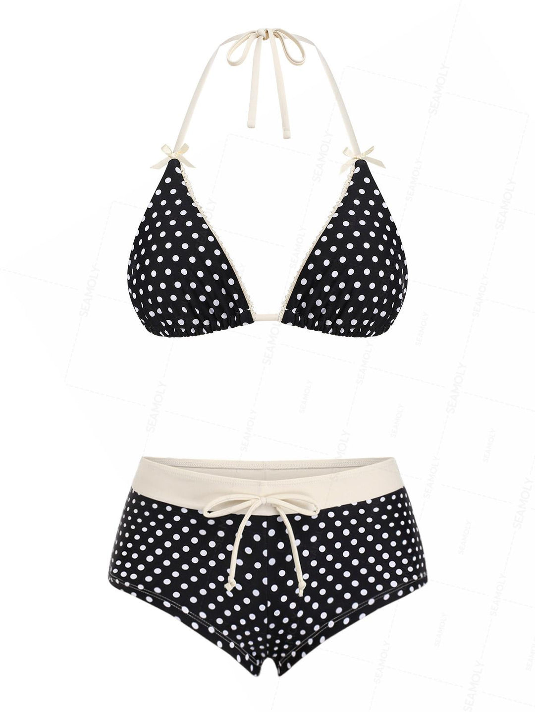 Seamolly Polka Dot Lace Bowknot Cheeky Boyshorts Bikini Set