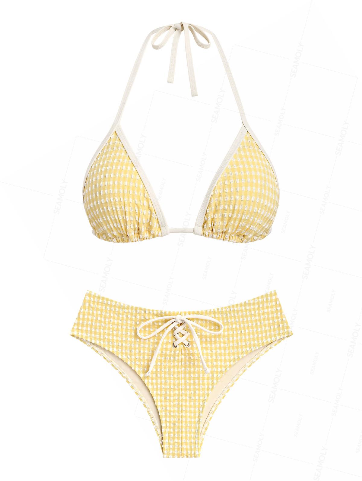Seamolly Gingham Textured Grommet Lace Up Full Coverage Bikini Set