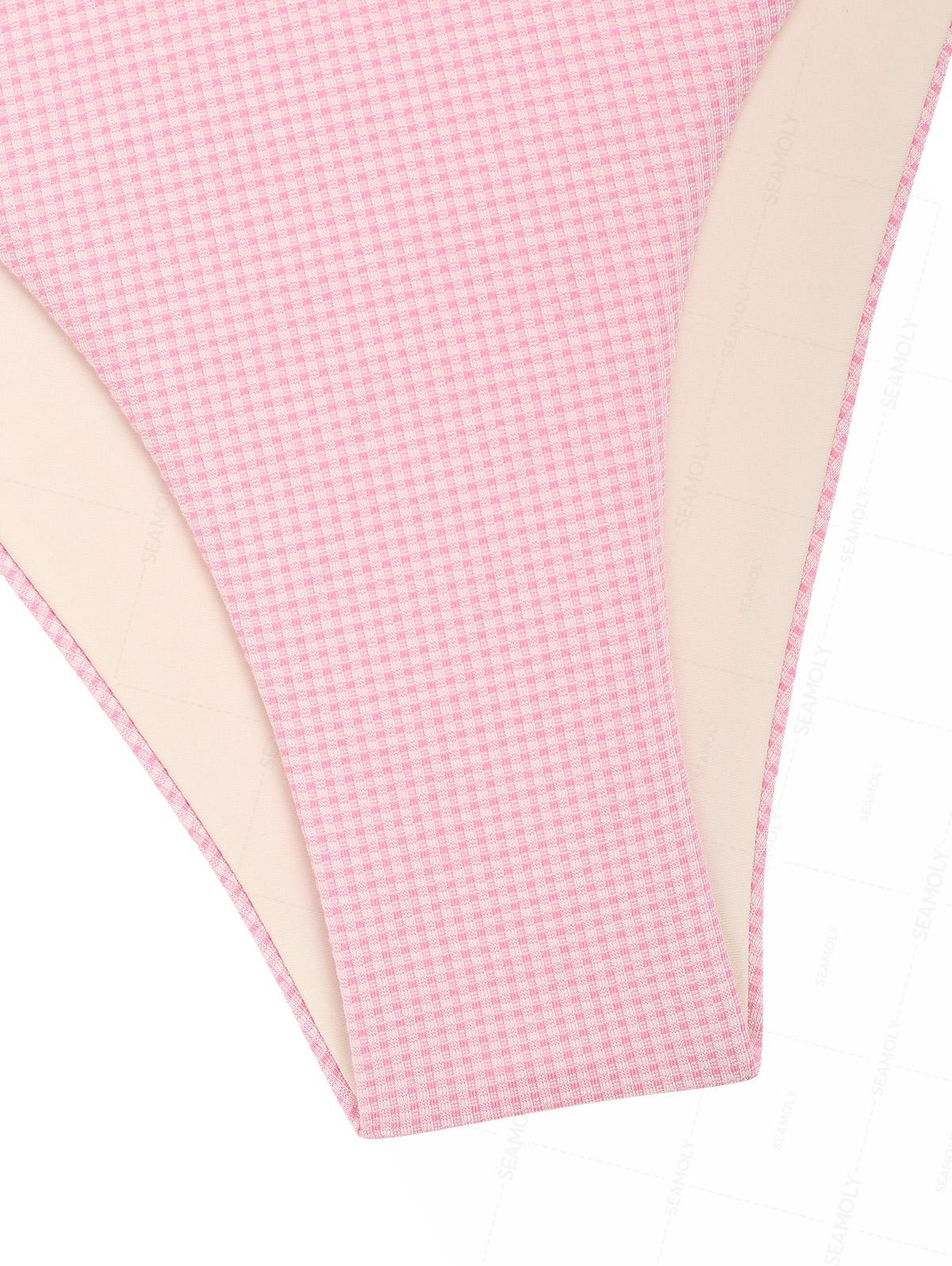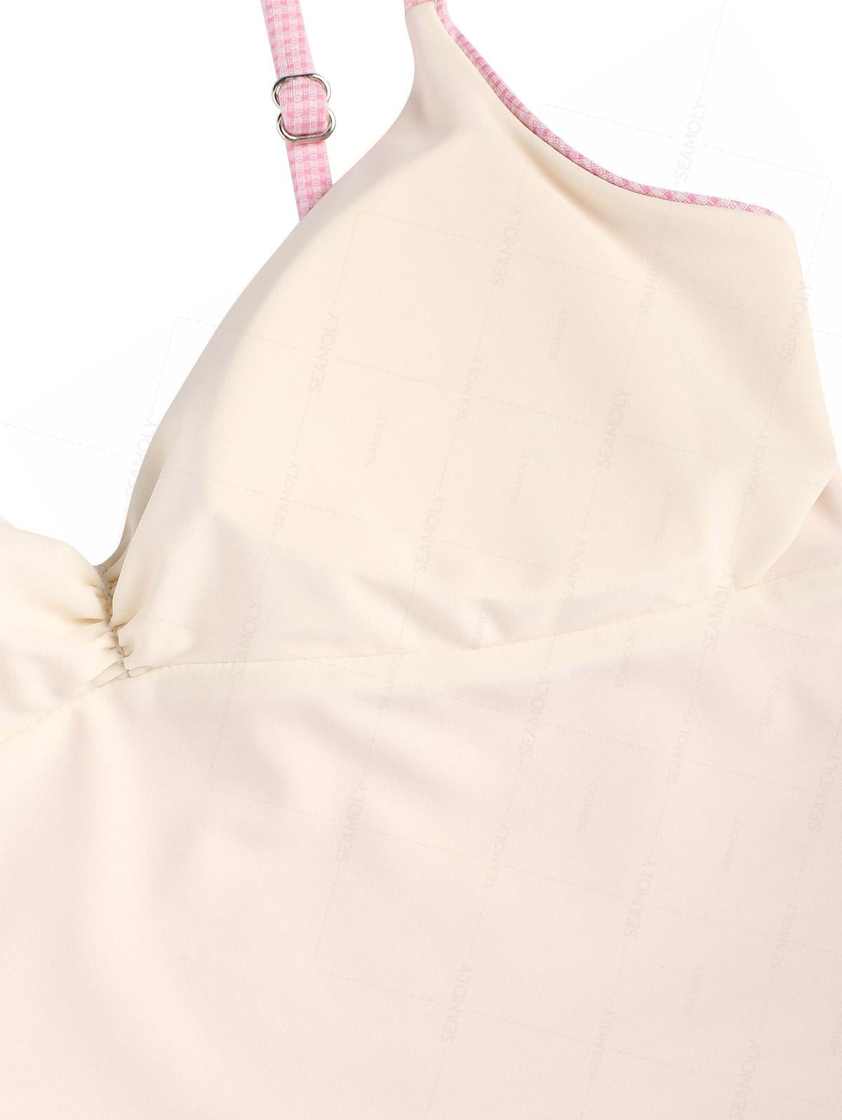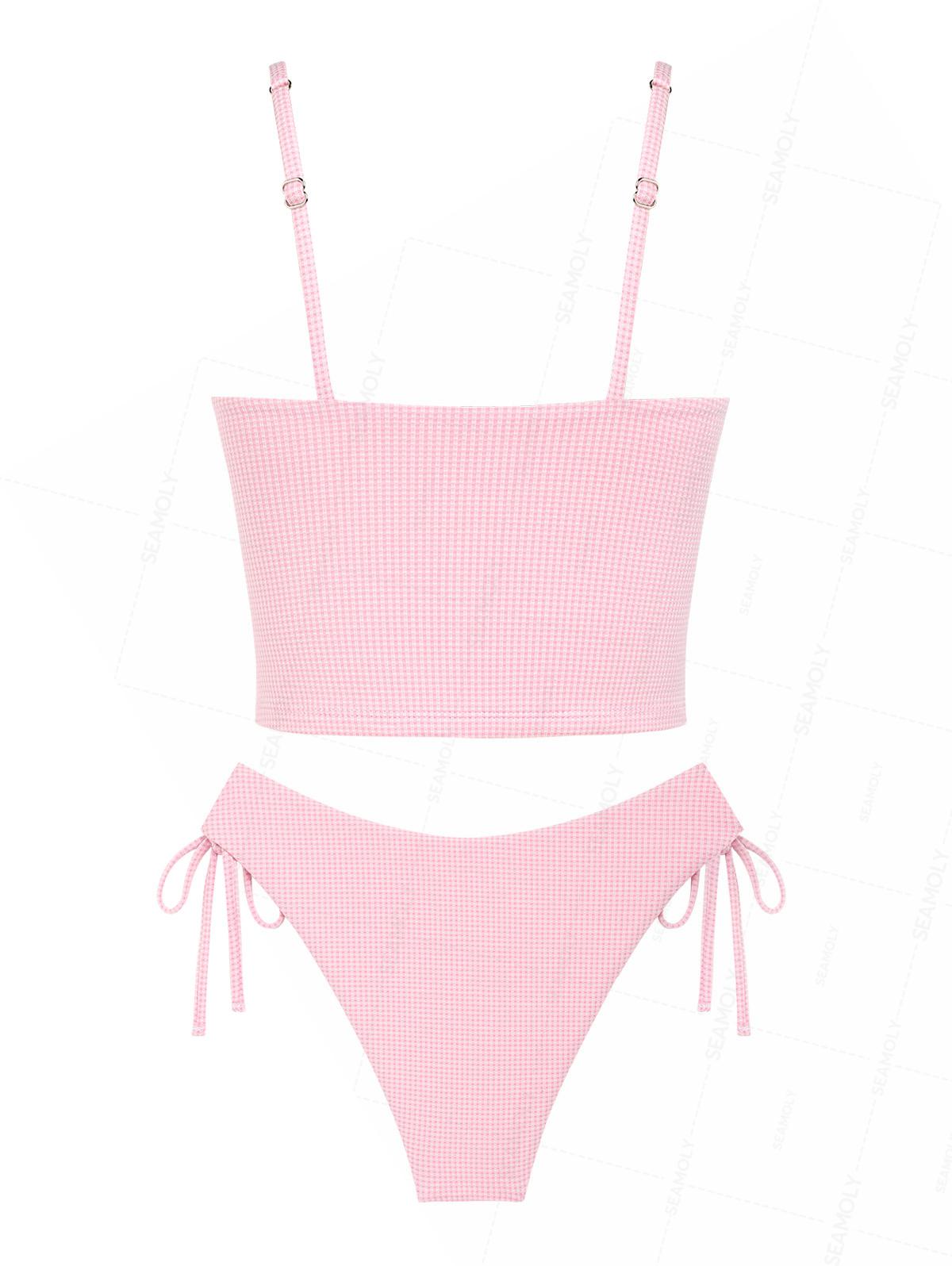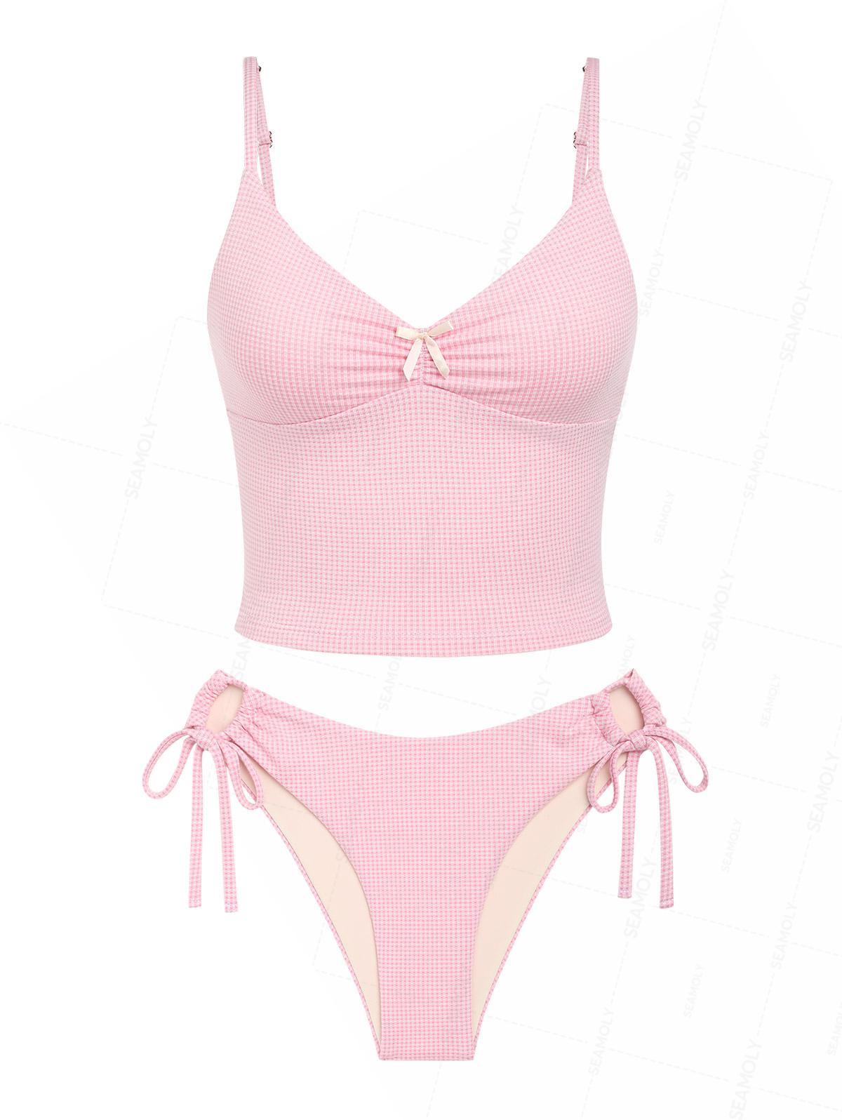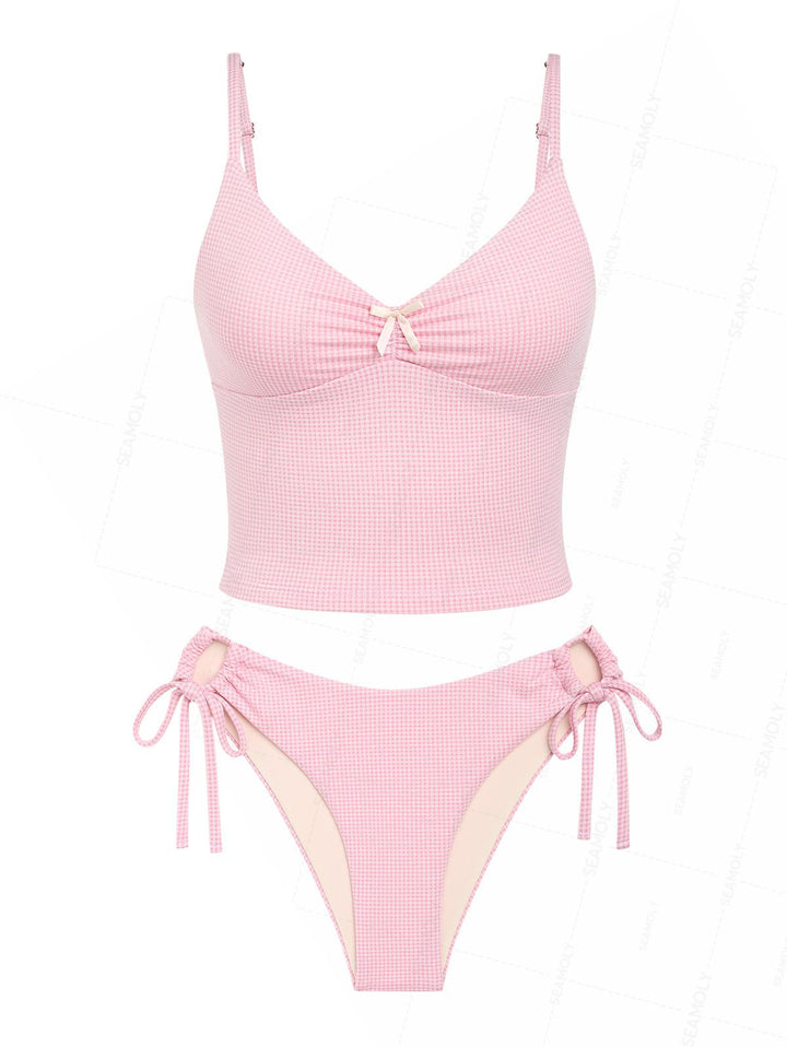 Seamolly Gingham Ruched Bowknot Decor Cinched Tie Side Tankini Set