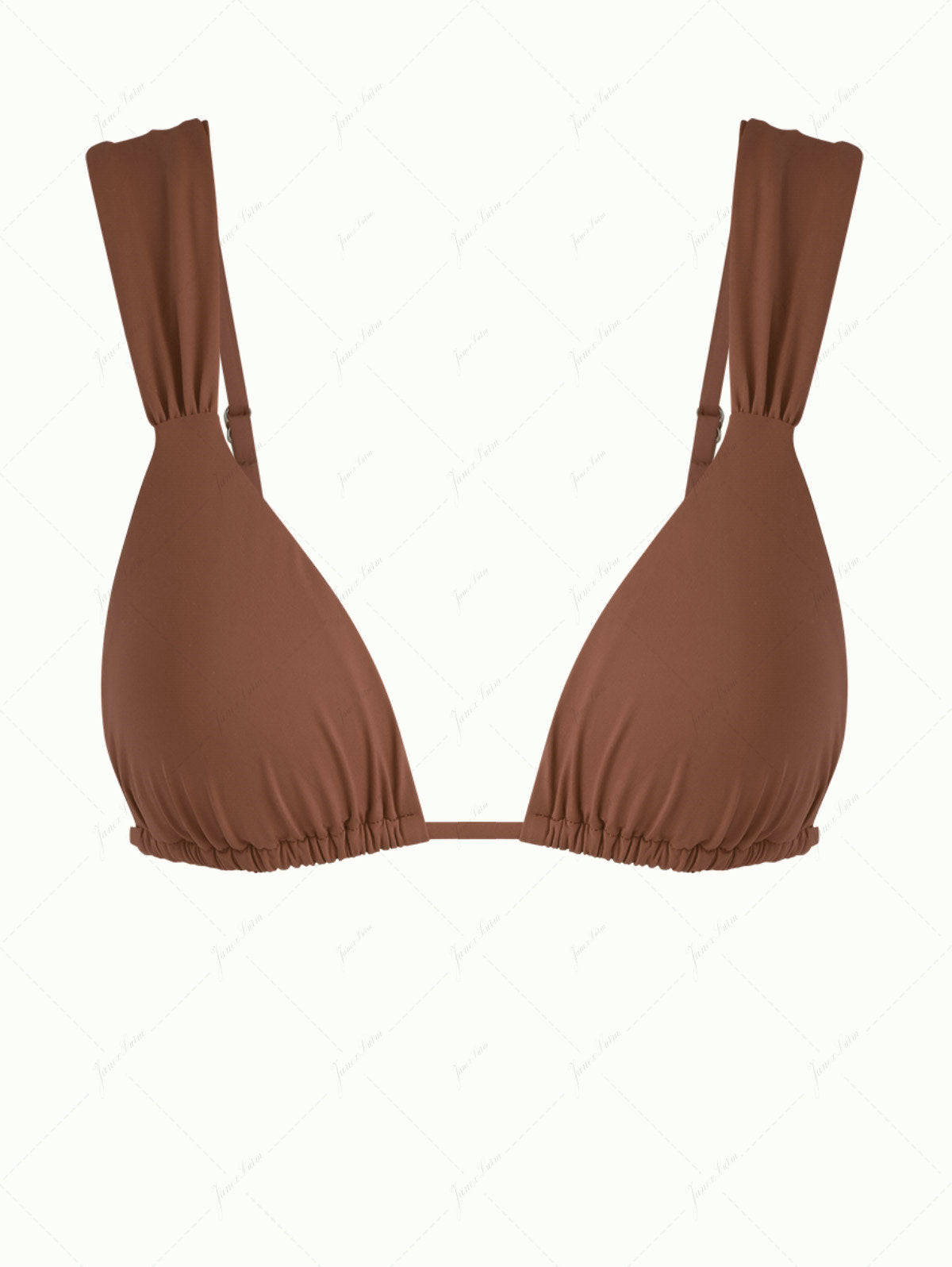 Brown Solid Color Ruched Wide Straps Triangle Bikini Top