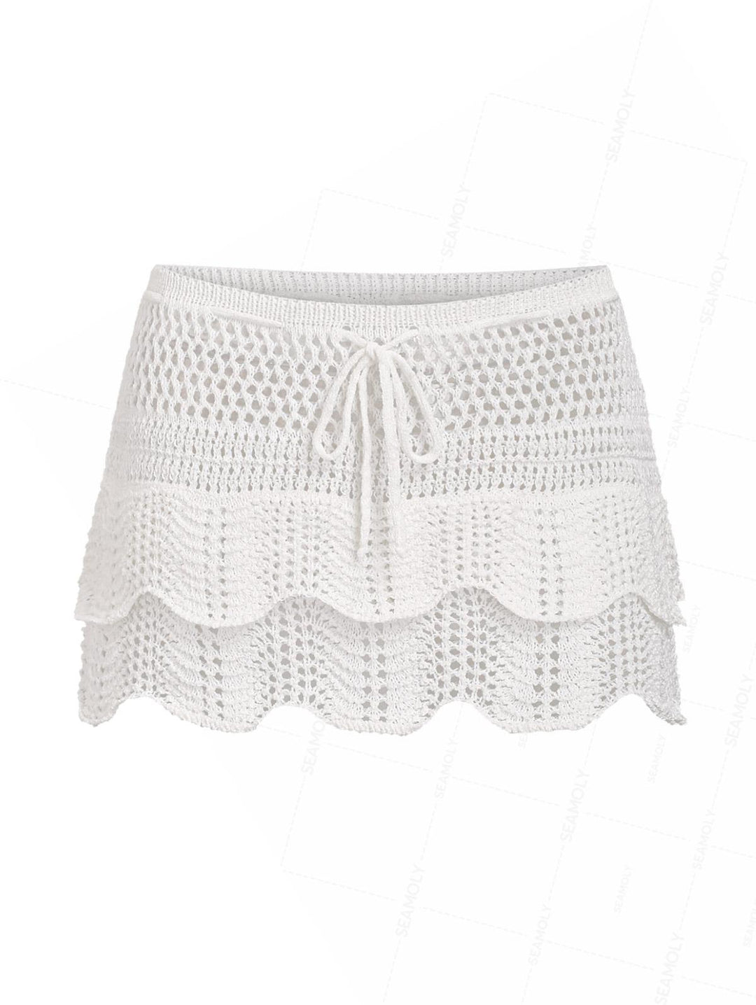 Crochet Double Layered Scalloped Hem Drawstring Mini Beach Cover Up Skirt