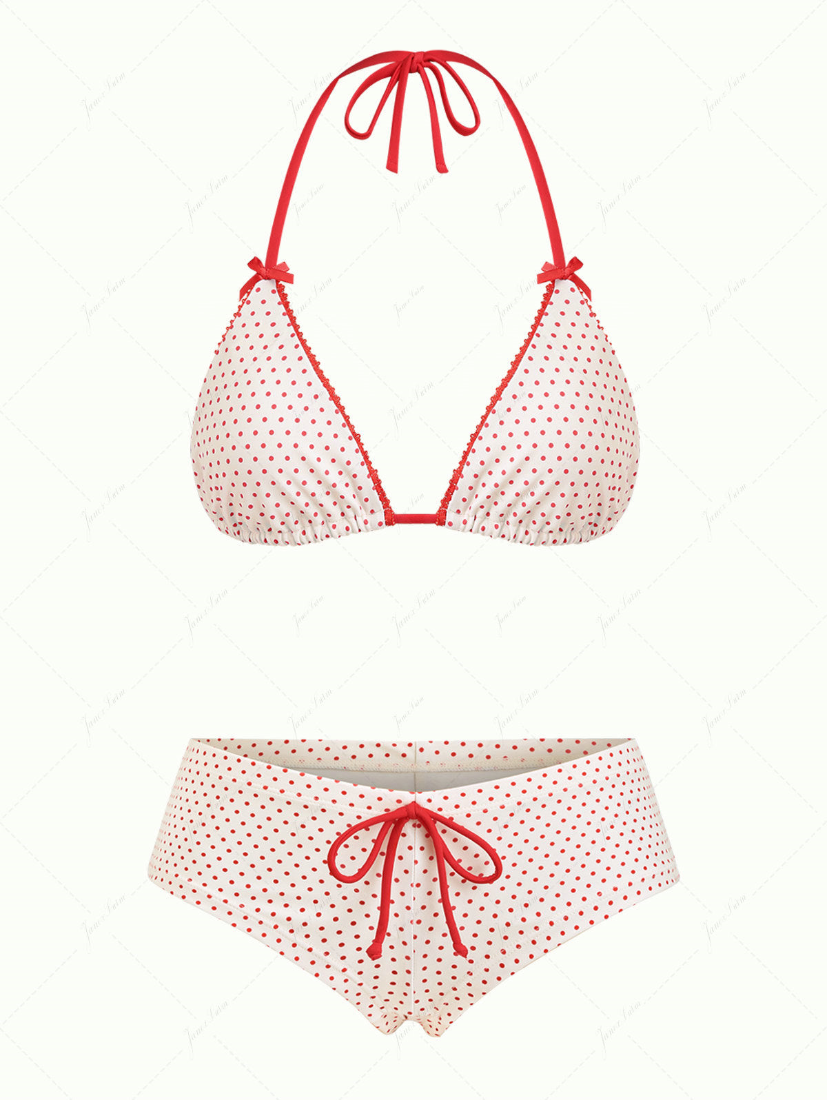 Janex Crystal Cream Polka Dot Lace Bowknot Triangle Cheeky Boyshorts Bikini Set