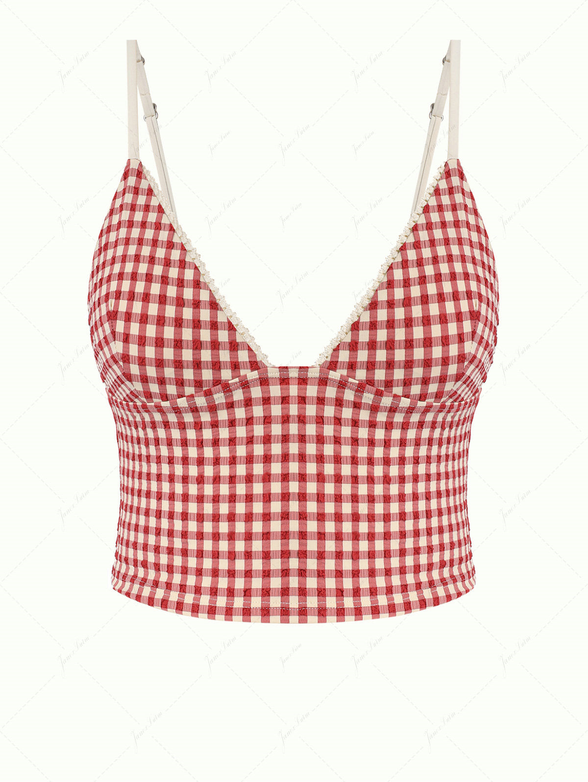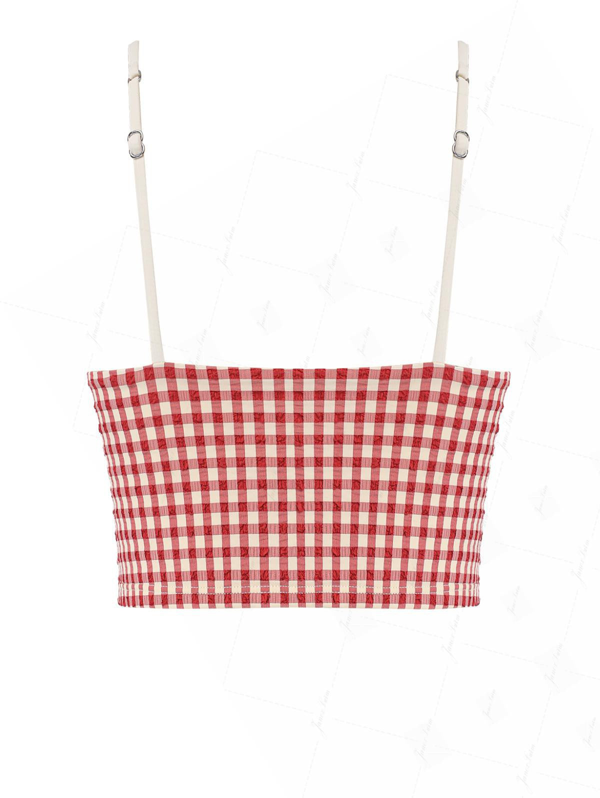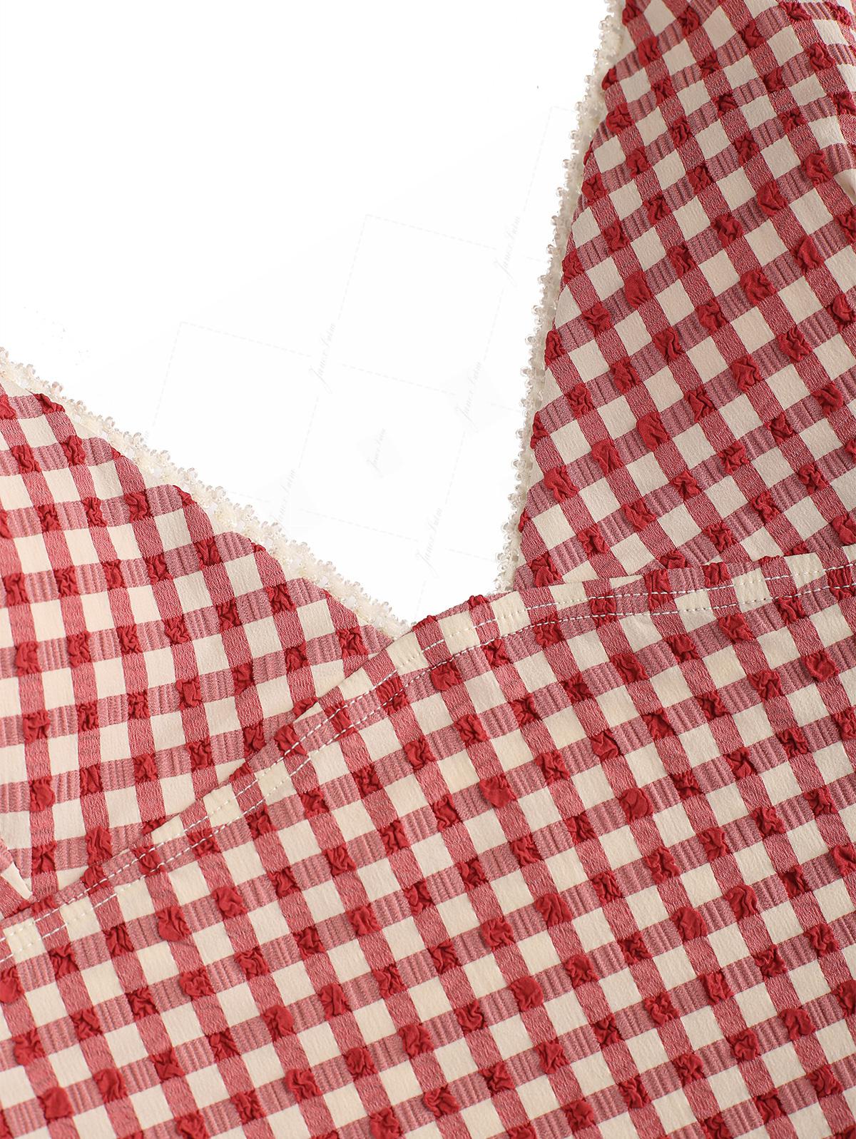 Pomegranate Red Gingham Lace Trim Slim Fit Cami Tankini Top