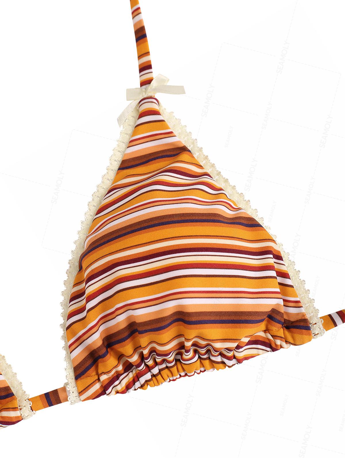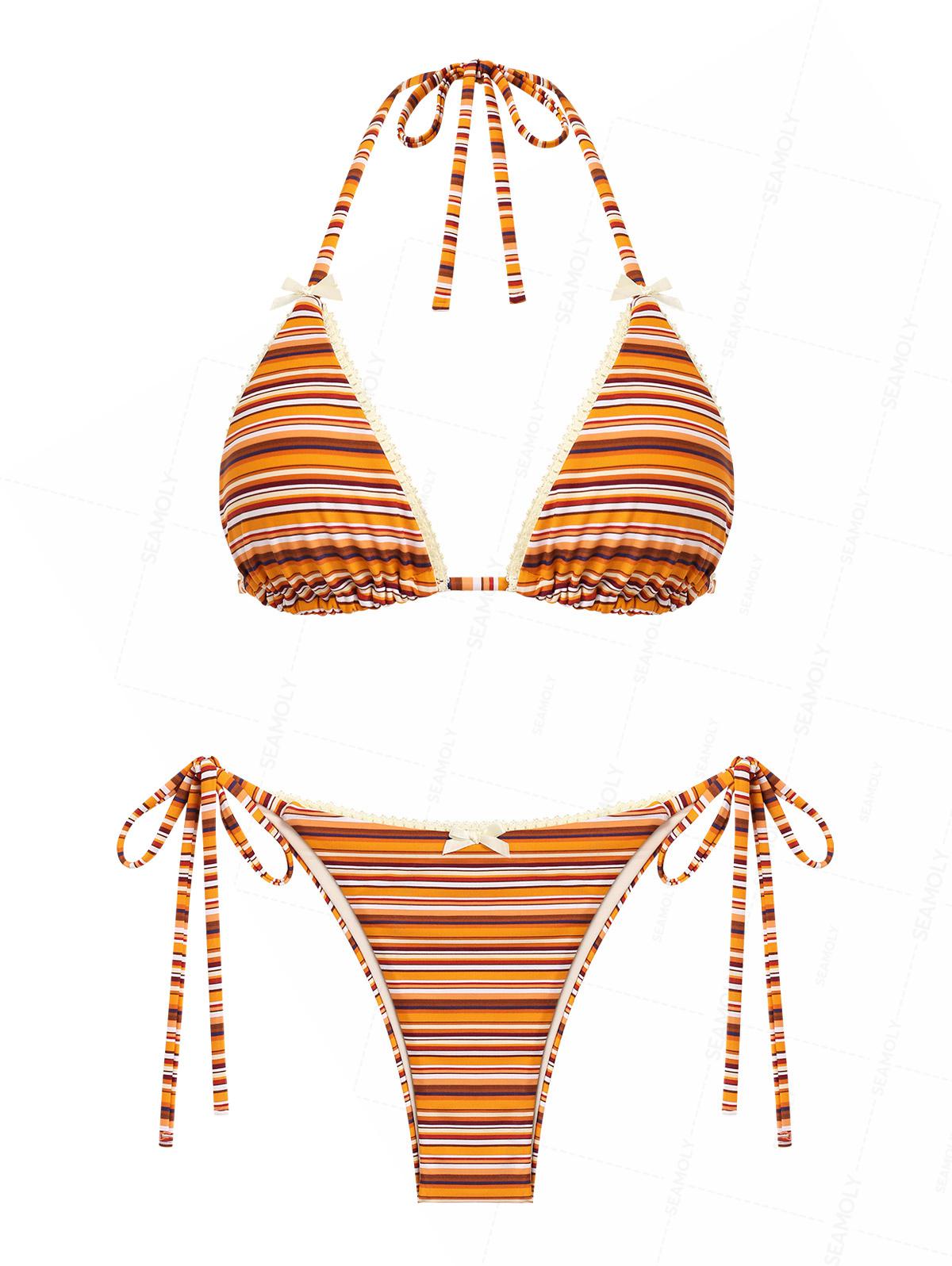 Seamolly Striped Lace Bowknot Halter Triangle String Bikini Set