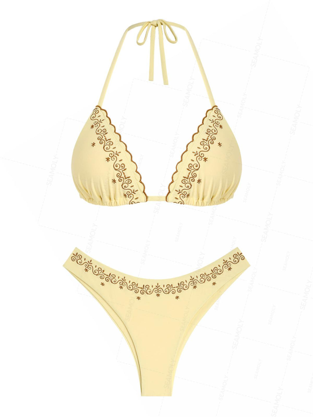Seamolly Embroidered Scalloped Edge Halter Triangle Bikini Set