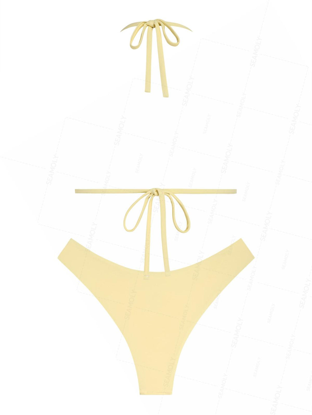 Seamolly Solid Color Ruched Halter Triangle Top & Brazilian Bottom Bikini Set