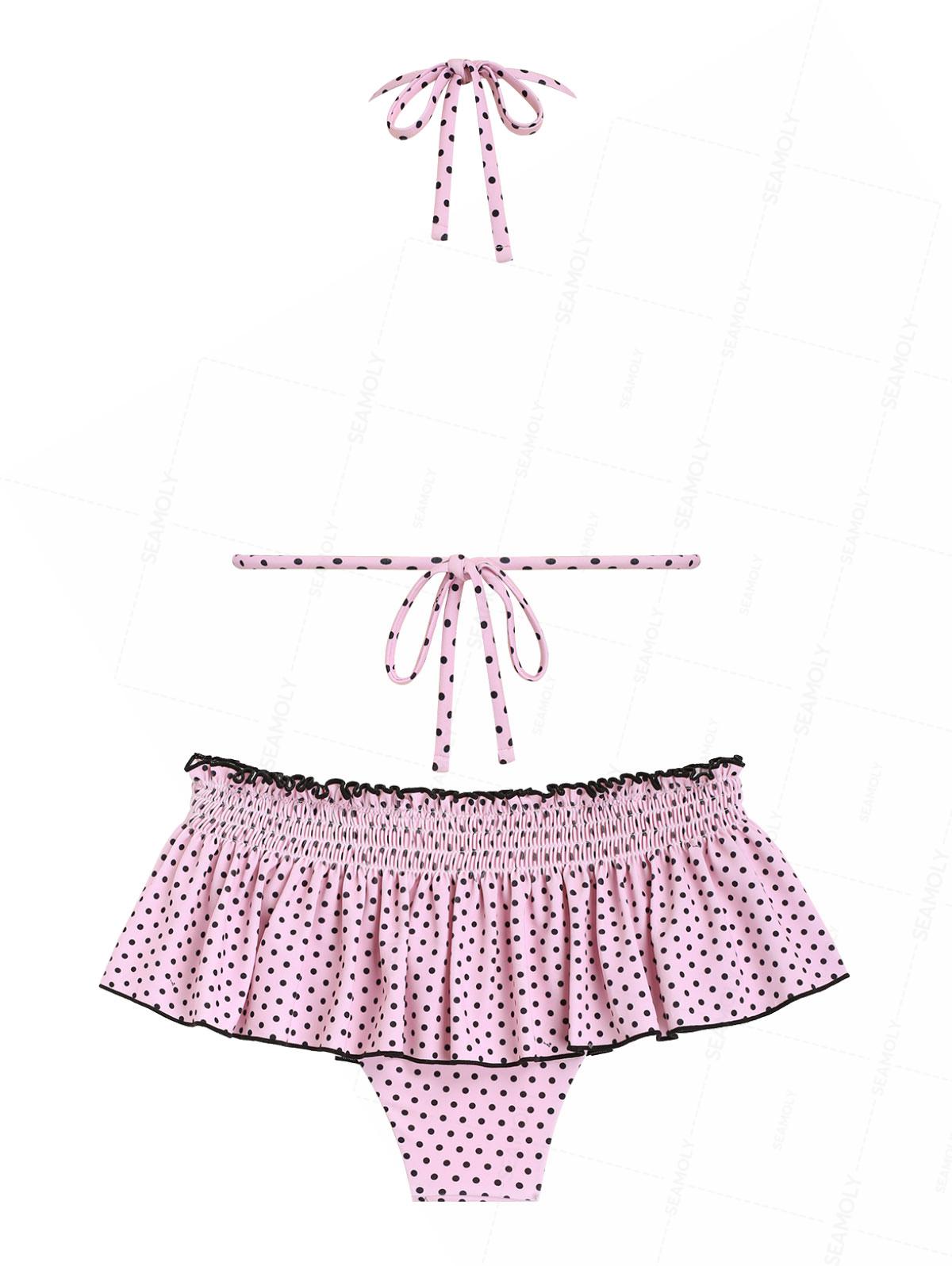 Seamolly Polka Dot Lace Bowknot Smocked Ruffles Skirtini Bikini Set