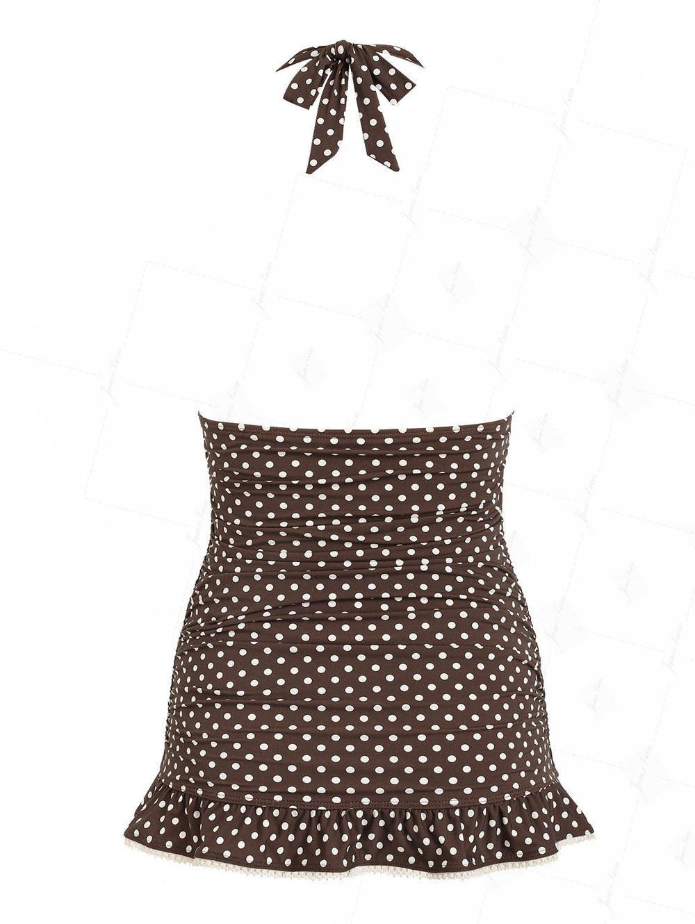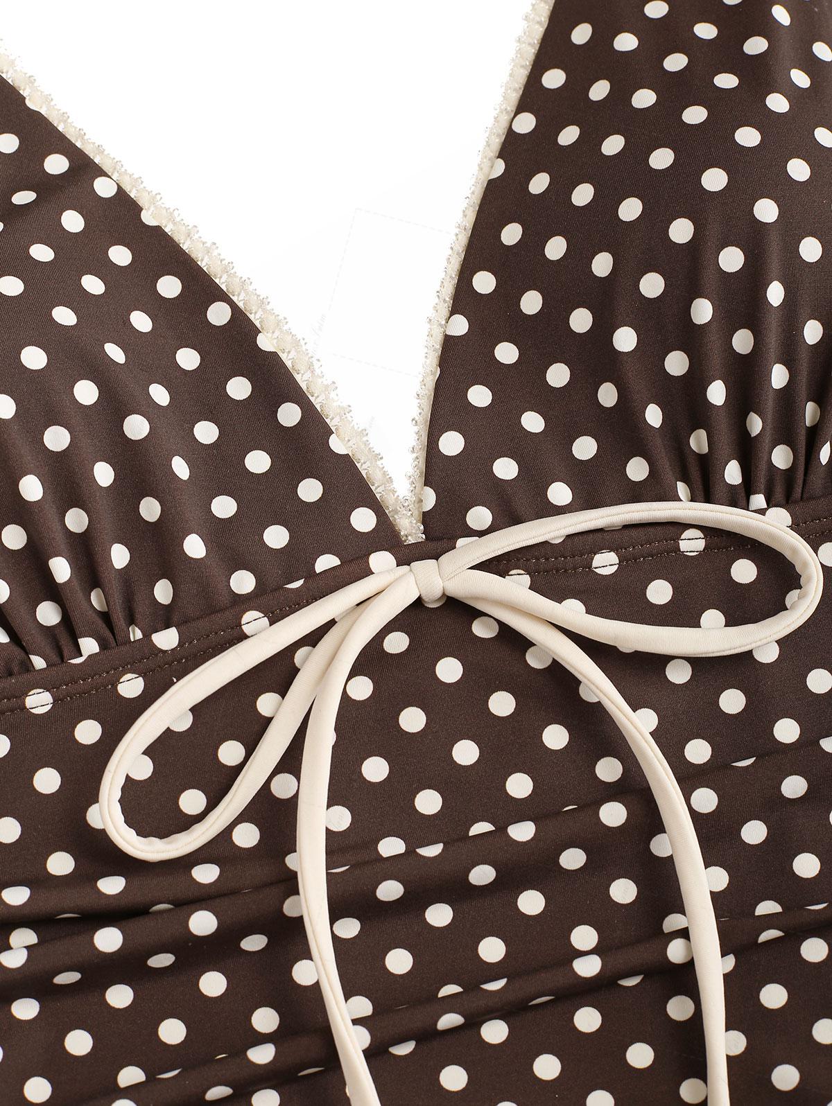 Deep Coffee Polka Dot Ruched Ruffles Halter Skirted One-piece Swimsuit