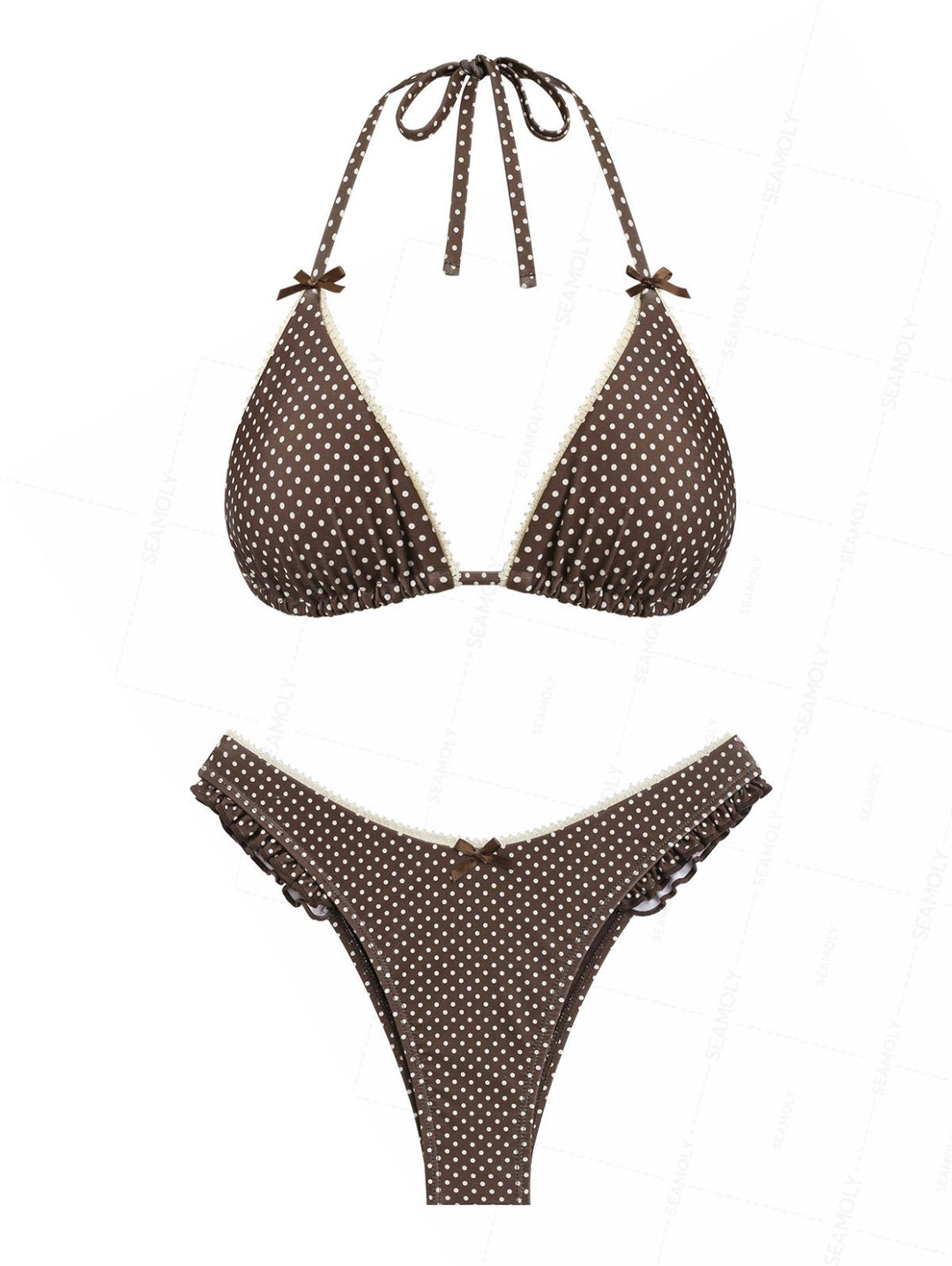 Seamolly Polka Dot Lace Bowknot Ruffles Trim Halter Triangle Bikini Set