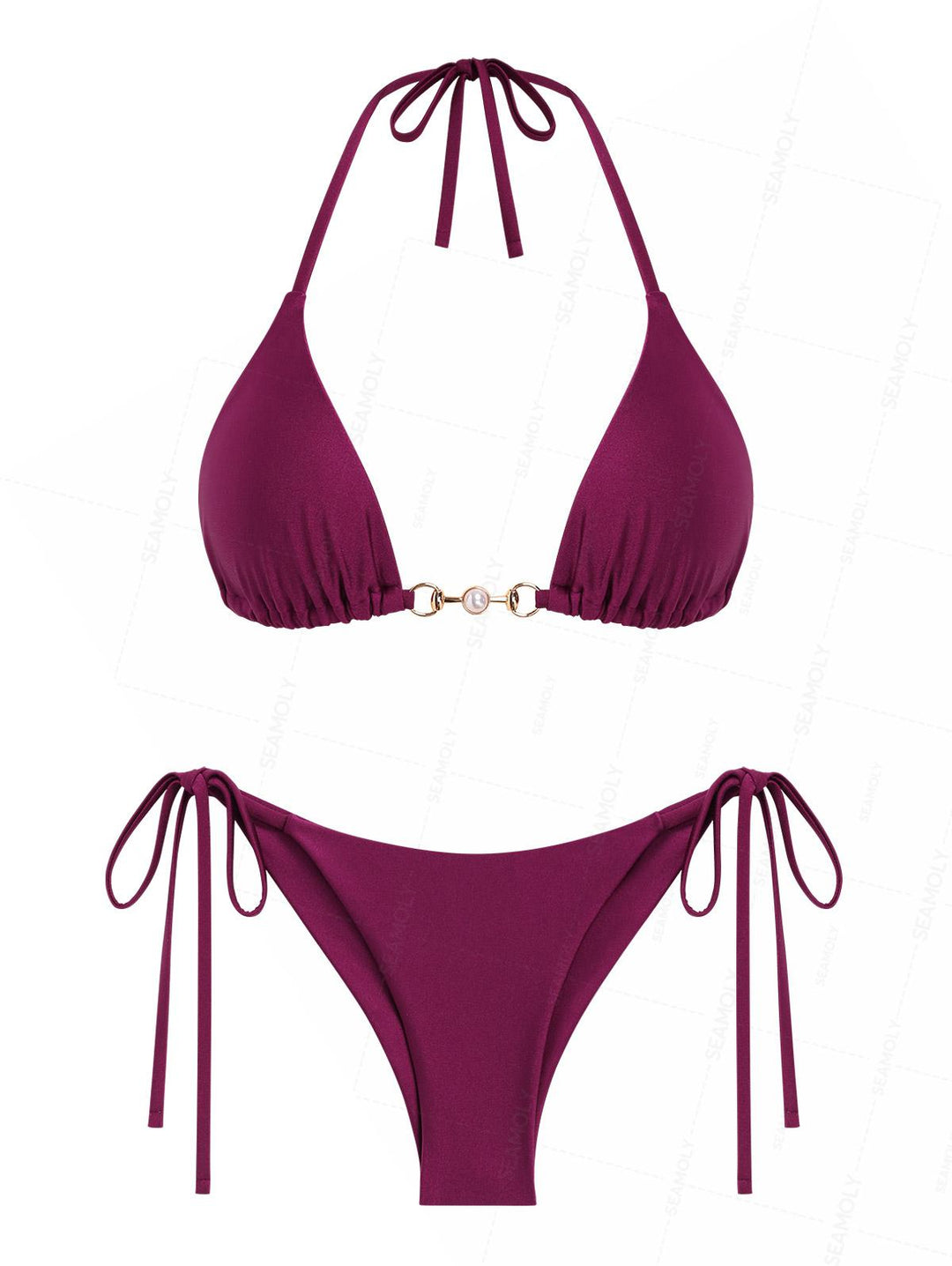 Seamolly Faux Pearl Decor Halter Triangle Top & Brazilian Bottom Bikini Set