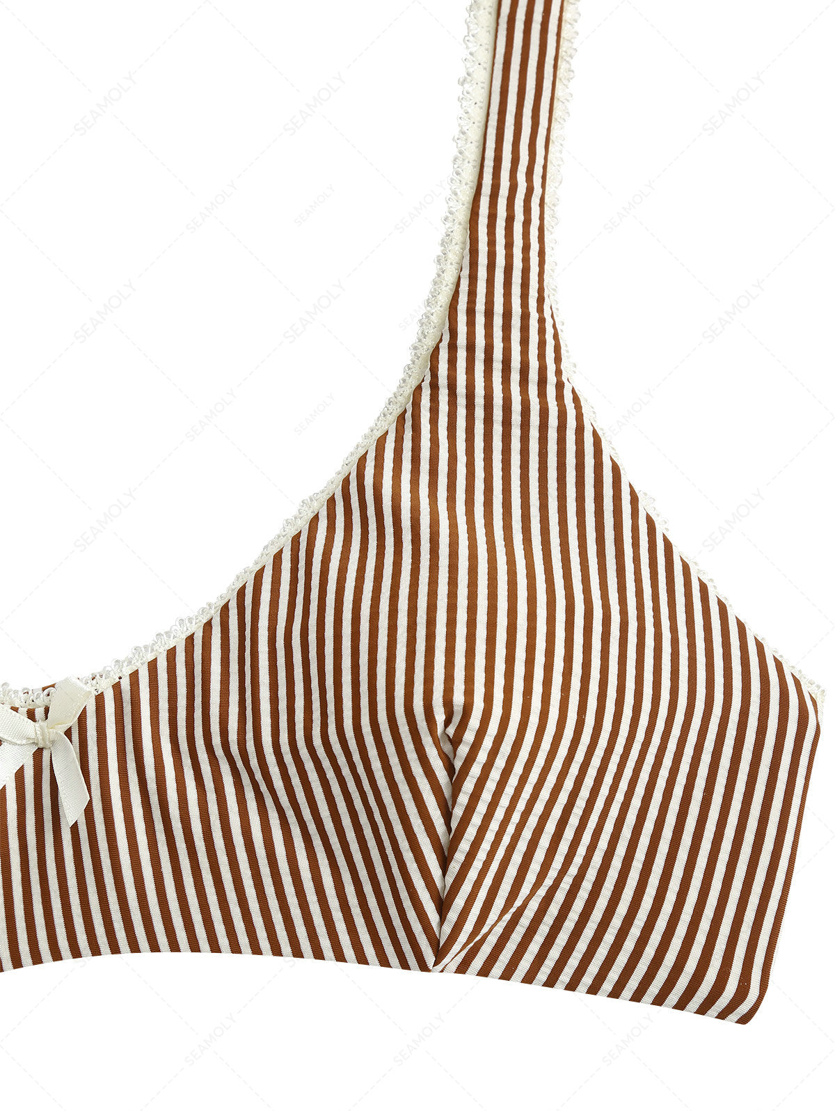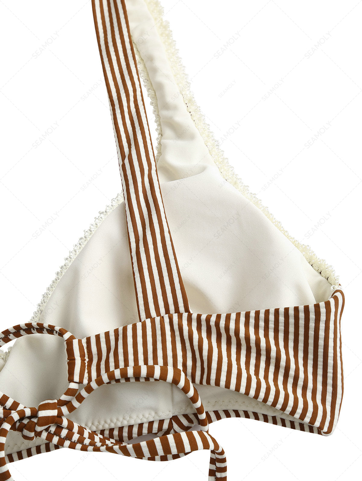 Seamolly Coffee Striped Lace Bowknot Tank Bikini Top