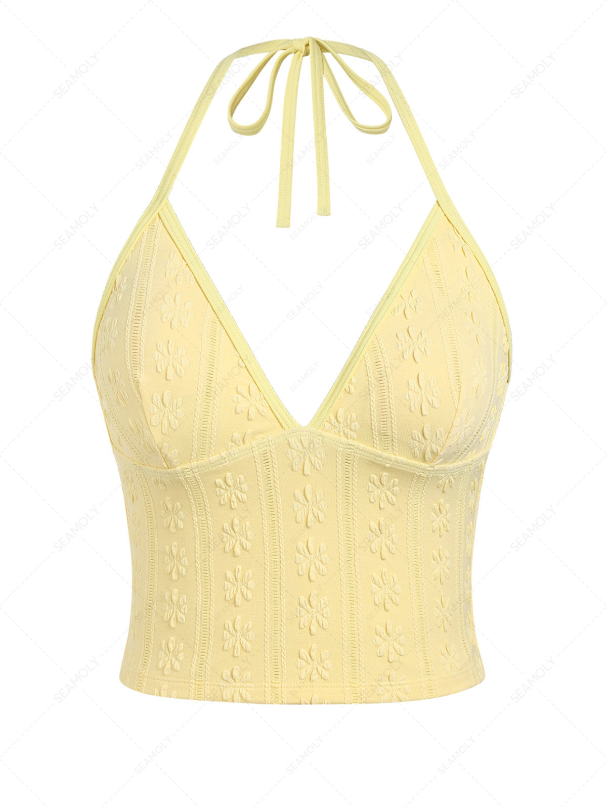 Yellow Floral Jacquard Textured Halter Tied Bikini Tankini Top