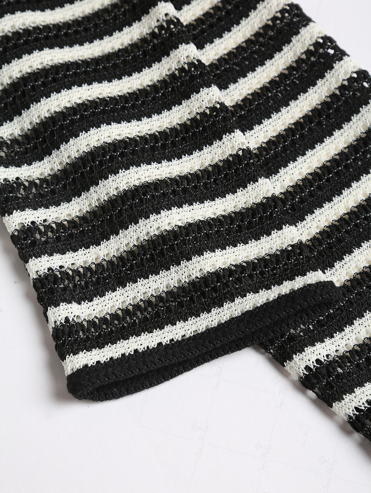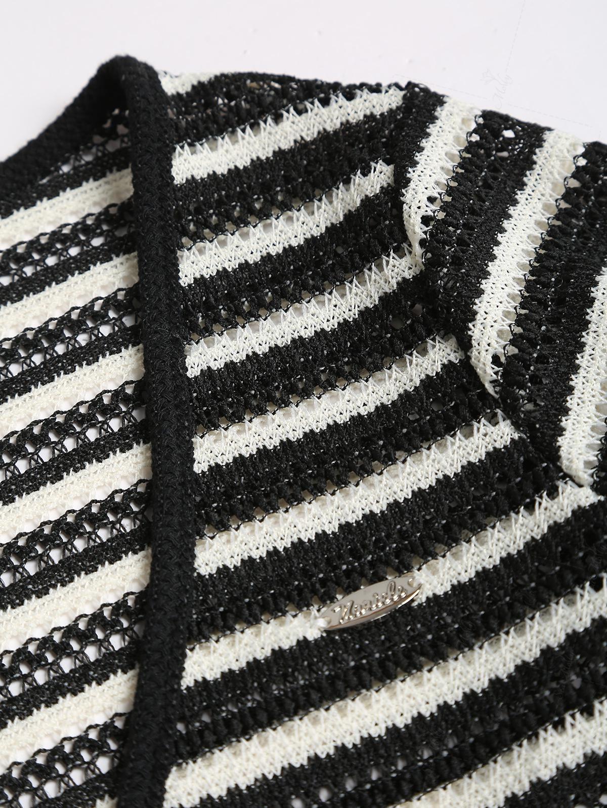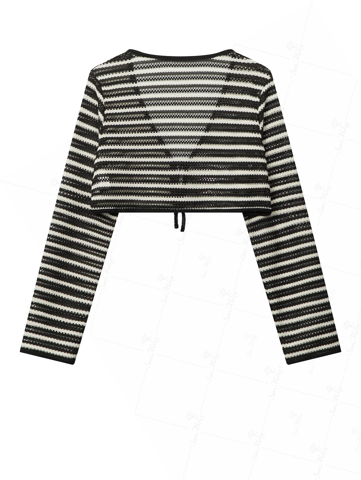 Striped Openwork Long Sleeves Tie Front Crop Knit Cardigan