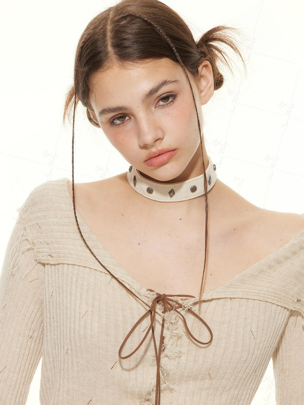 Ripped Distressed Raw Edge Design Beading Tie Front Slim Fit Long Sleeve Knit Cardigan