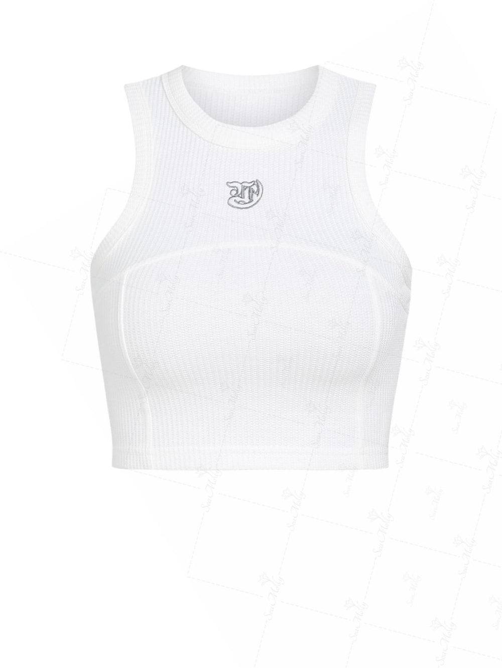 Seam Detail Embroidery Design Racerback Crew Neck Slim Fit Crop Tank Top