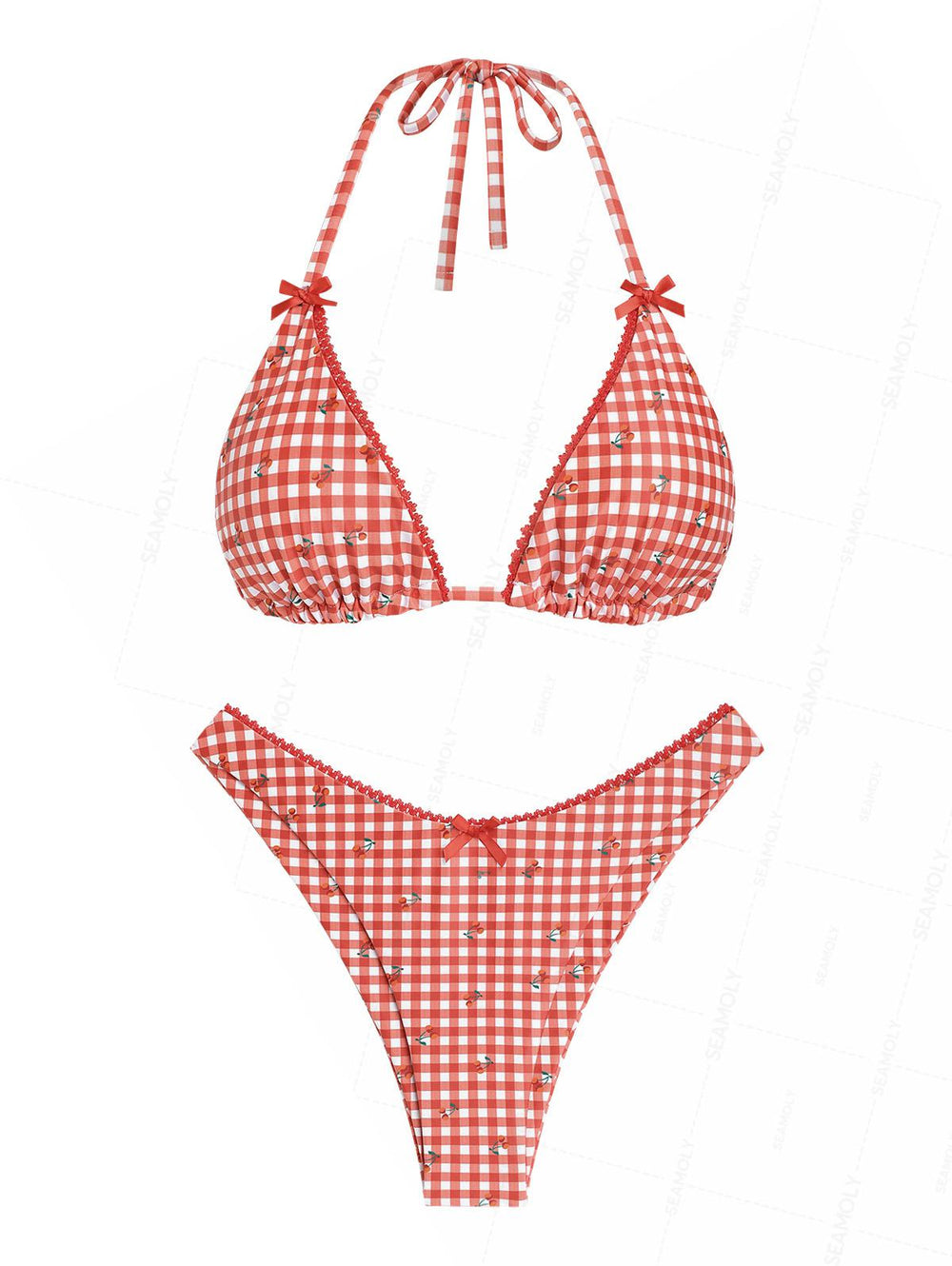 Seamolly Gingham Cherry Print Lace Bowknot Bikini Set